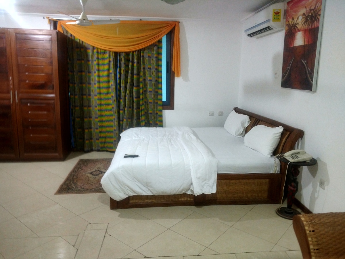 Come, relax in a stylish, cozy, chic, african themed urban apartment equipped with modern amenities including air-conditioning, high speed internet and a standby generator. It is located in the trendy neighbourhood of East Legon, 4.5 km from the airport and minutes drive from shopping malls. Walking distance from eateries and trendy spots of all cuisines. Great for families and friends on vacation.