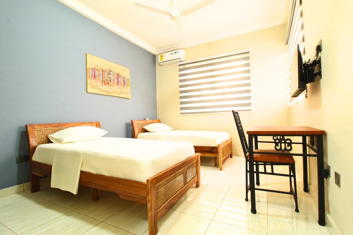 Keep it simple at this peaceful and centrally-located place on a beautiful tree-lined street in East Legon, Accra. This guest house offers everything you need for a comfortable stay. Completely renovated with new windows, doors, tiles, fixtures, appliances, and furnishings. it also has A/C units, Wi-Fi, and Flat Screen TVs in each room. Equipped with home security system, on-site concierge, with car and driver available for rent. Come home and enjoy yourself!