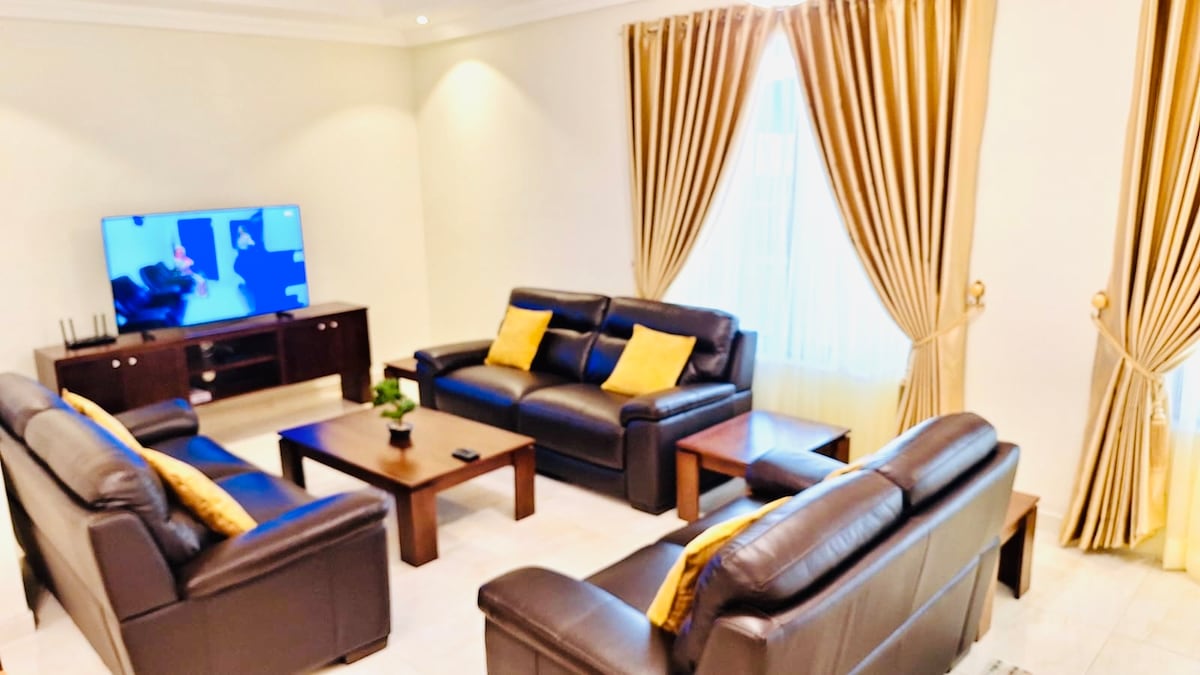 Welcome to our PLUSH 3-bedroom home, designed for comfort, elegance, and convenience. Each bedroom is en-suite and fully air-conditioned, offering privacy and relaxation for every guest. Located 10 mins from Airport, in a secured, elite, and family-friendly community, this spacious home features 24-hour electricity, 24 hr security, Parking, a contemporary fully furnished kitchen, and stylish modern décor throughout. WI-FI, DSTV Available.