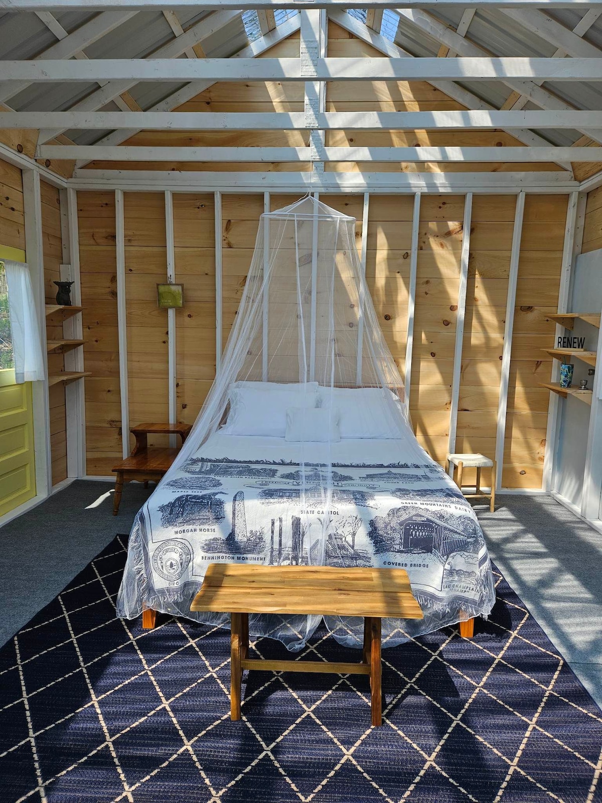 Get cozy and settle into this rustic space.Eco-Friendly and solar powered glamping at its finest, sitting on 40 plush acres of mountain view land. Whether you choose to relax your body in the soaking tub, rest your feet in the nearby creek, or finding games in the community shed, you'll have plenty to do.