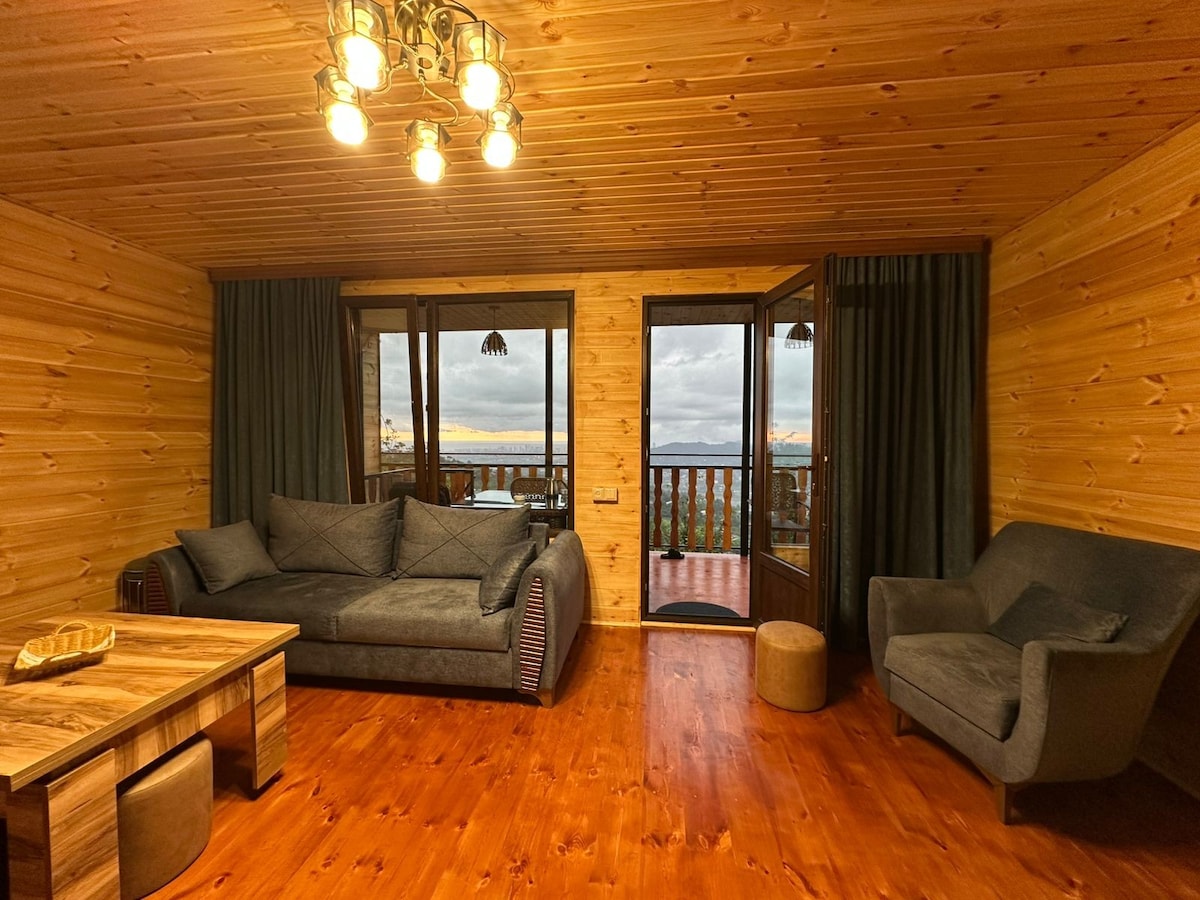 Welcome to our cabin Greenland Pheria, where rural atmosphere meets comfort in the vibrant heart of nature. This bright and stylish cabin offers stunning sea and mountain views from your private balcony and bay windows, just a stone's throw away from city of Batumi. Enjoy the convenience of complimentary air conditioning and Home Theater Projector among other modern amenities.