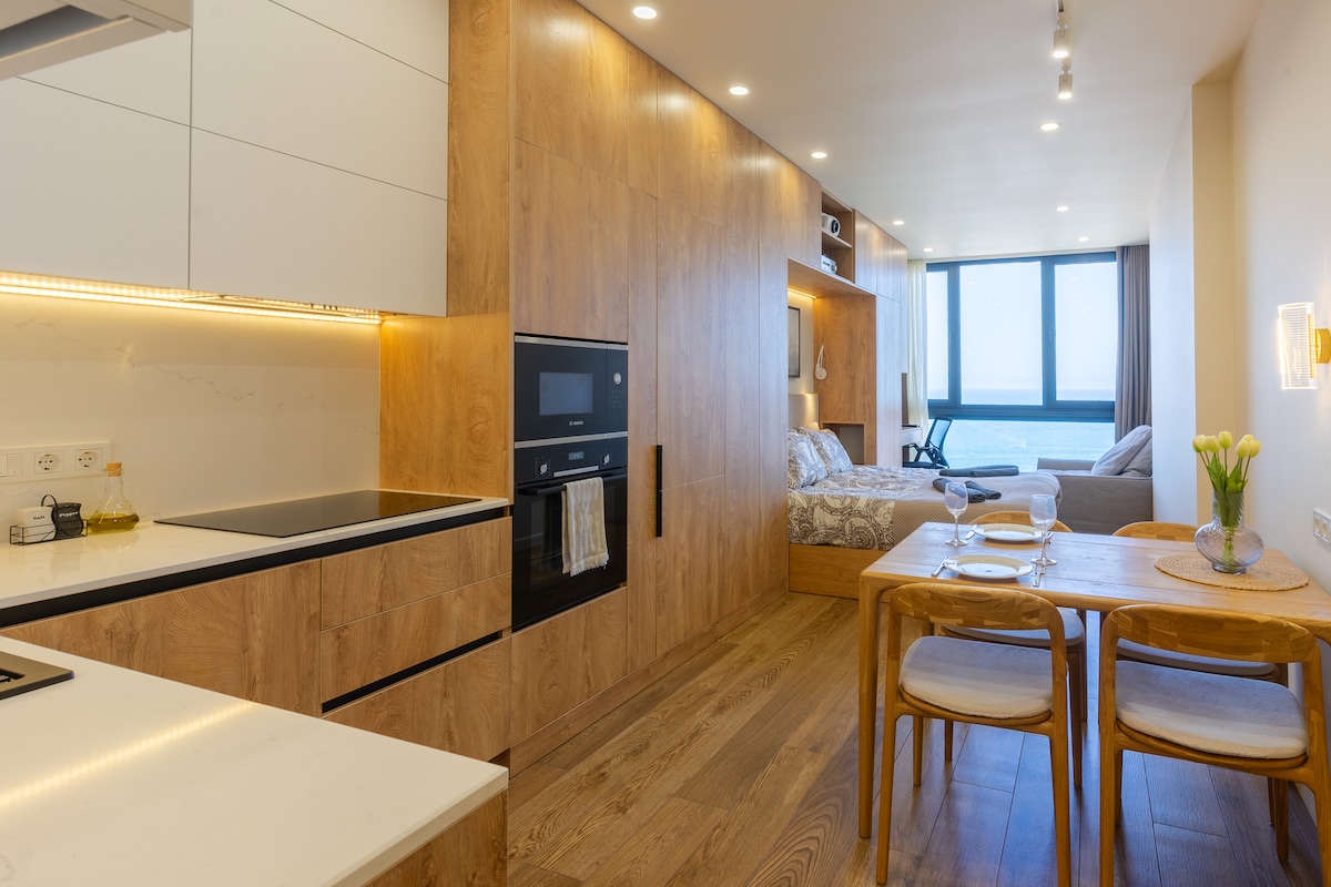 现代1卧室+公寓,带厨房、阳台和海景
