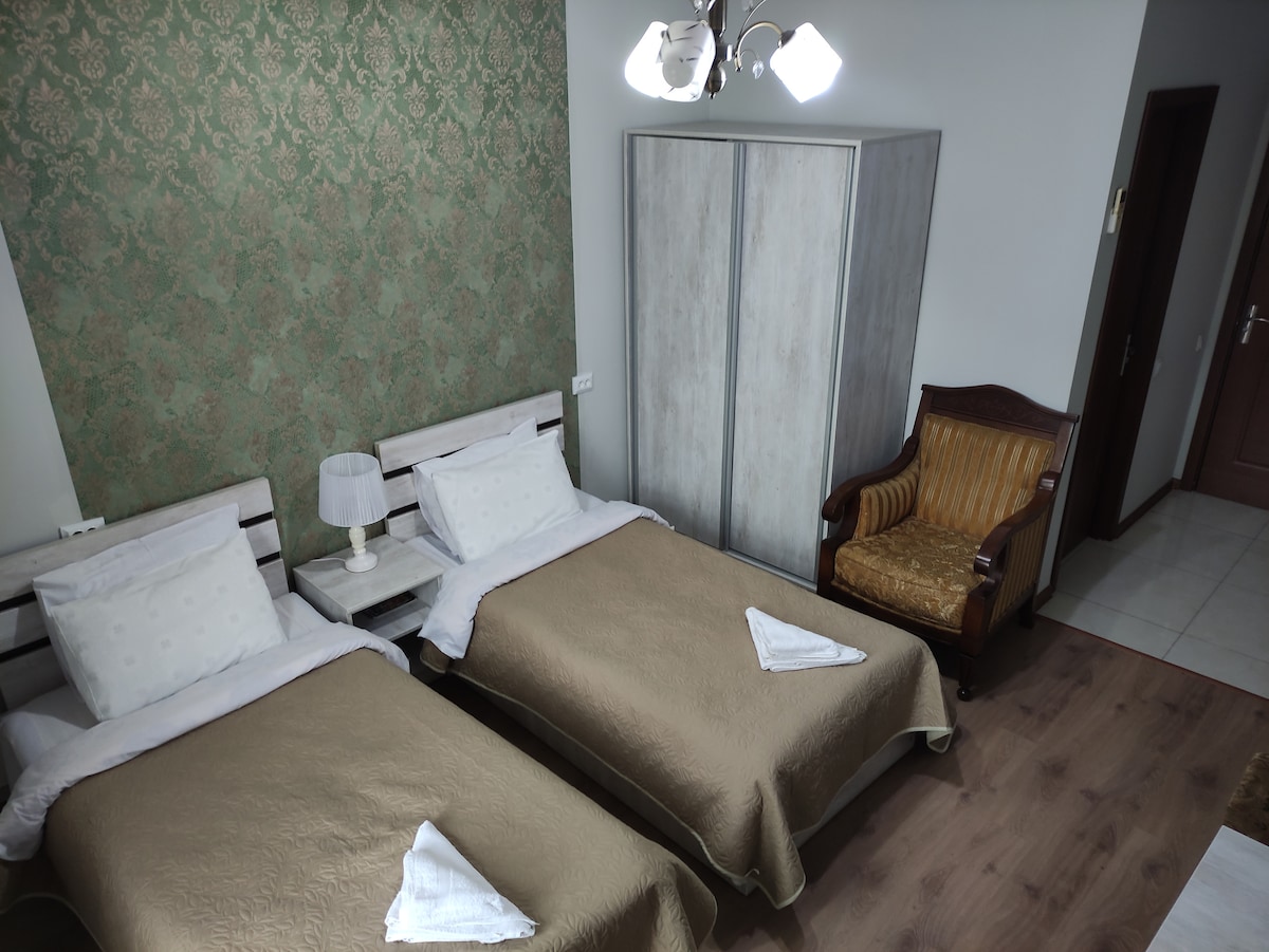 Welcome to Blue Escape – a calm, hotel-style room with balcony and access to a newly built shared drop pool surrounded by nature. Designed in soft blue tones, it’s perfect for solo travelers or couples seeking peace and comfort. Enjoy the fresh air, relax in a cozy bed, and stay connected with Wi-Fi and smart TV. While there’s no kitchen, great cafés are nearby. A quiet retreat just minutes from Batumi’s center.