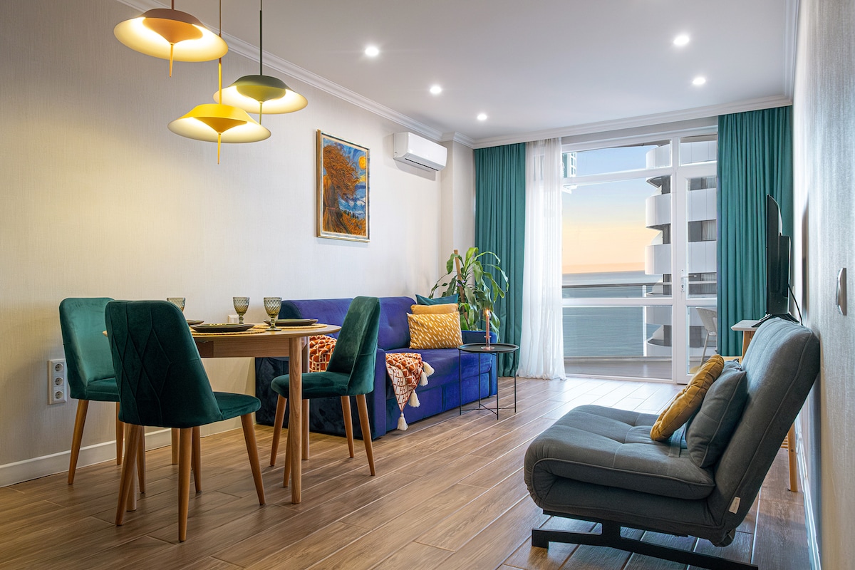 Панорамный вид, высота окон 5 метров, современный ремонт, высококлассная мебель и техника. Все это будет сопровождать Вас во время отдыха в Батуми. Каждый день Вы будете просыпаться с ошеломляющим видом на море непосредственно с кровати. Вы будете выпивать утренний кофе в компании с ласковым морем. А вечером, с друзьями Вы будете встречать закат, находясь на большом диване, с комфортом и с бокалом грузинского вина в руке. Эти апартаменты откроют Вам новый вид отдыха. Почувствуйте "Вид на Море".