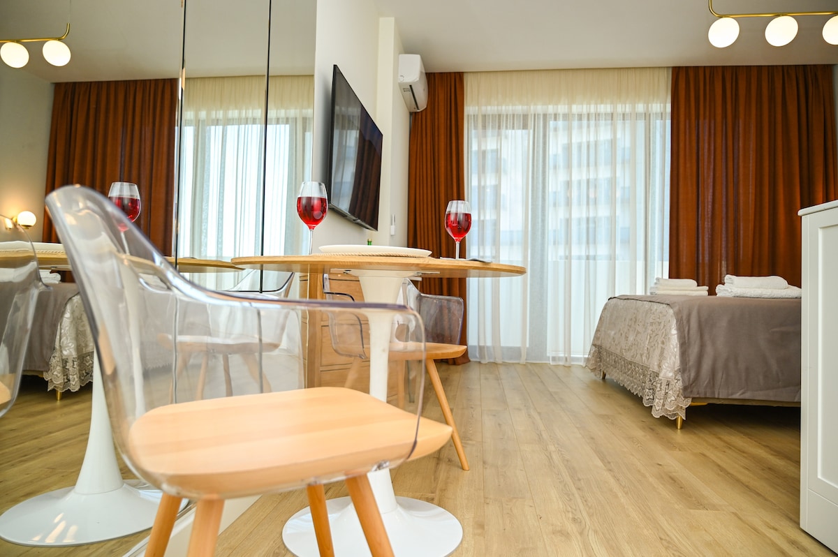 Elegant, air-conditioned, fully equipped, 1 bedroom, 1 bathroom and a living room with an open kitchen apartment on the 21st floor, 5 minutes walk to the sea, located at the New Wave hotel complex. The apartment is modern furnished, perfect for couples, friends, families, or distant workers and business travellers. In the building there are additional amenities available for extra cost like pool, gym and a restaurant.