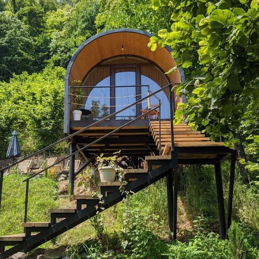 We are proud to present our unique glamping spot "Diogenes Barrel"; Have a comfortable and philosophical stay while surrounded by a vineyard, hazelnuts, small tea plantation, bamboo forest, private stream, and a beautiful view of Gomi mountain. This one of a kind stay is located in West Georgia, Guria region where people are always cheerful and welcoming, the nature is subtropical and green, rivers are fast and noisy, and traditional songs are spirited and still sung.