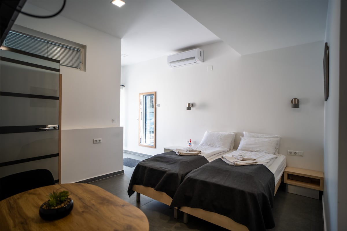 Welcome to your perfect getaway! This charming 3-room flat offers a comfortable retreat in the heart of the city. Enjoy a cozy, well-furnished space, perfect for relaxing after sightseeing or work. Each bedroom features comfy bedding, ample storage, and work tables. The flat includes a modern bathroom, a small kitchenette, and a spacious terrace. Plus, free parking for 2 vehicles is available on the premises. For each adult person who arrives, there is a tourist tax to be payed, 3,13€ / person