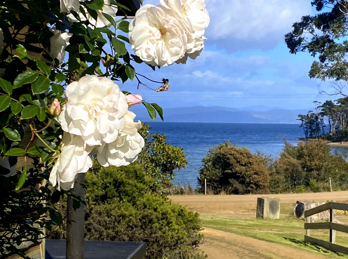 Stay in one of the only Bruny Island waterfront properties that has spectacular ocean and mountain views from the living/dining/kitchen and bedroom, not to mention the enormous deck. Relax in bohemian luxury on 2 acres of natural bush and garden in the former art studio, now a private guest home, complete with unlimited WIFI. Full of artwork and Persian rugs, this is a place to unwind and absorb the peace and amazing views, especially at sunset, with uninterrupted access to the water's edge.