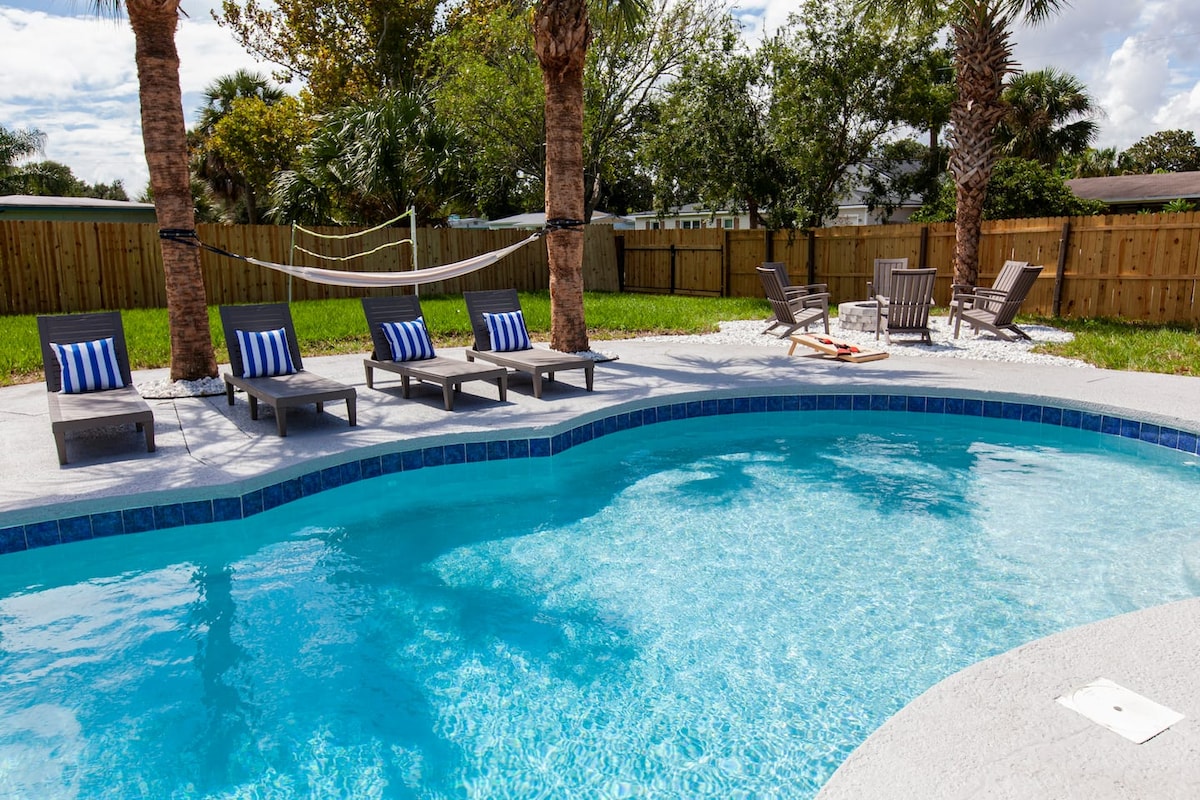 Sailfish is a serene 4BR/2.5BA retreat just 11 blks from the beach. Relax in your private oasis with a heated pool, putting green, pergolas, & outdoor dining. Head inside to bright open living spaces and a fully stocked kitchen. Upstairs, enjoy a king primary suite plus 3 other guest rooms. Game room fun and beach gear included - your perfect mix of comfort and coastal adventure. Dog friendly: We warmly welcome four-legged canine friends. No cats, please. (They don't like the beach!)