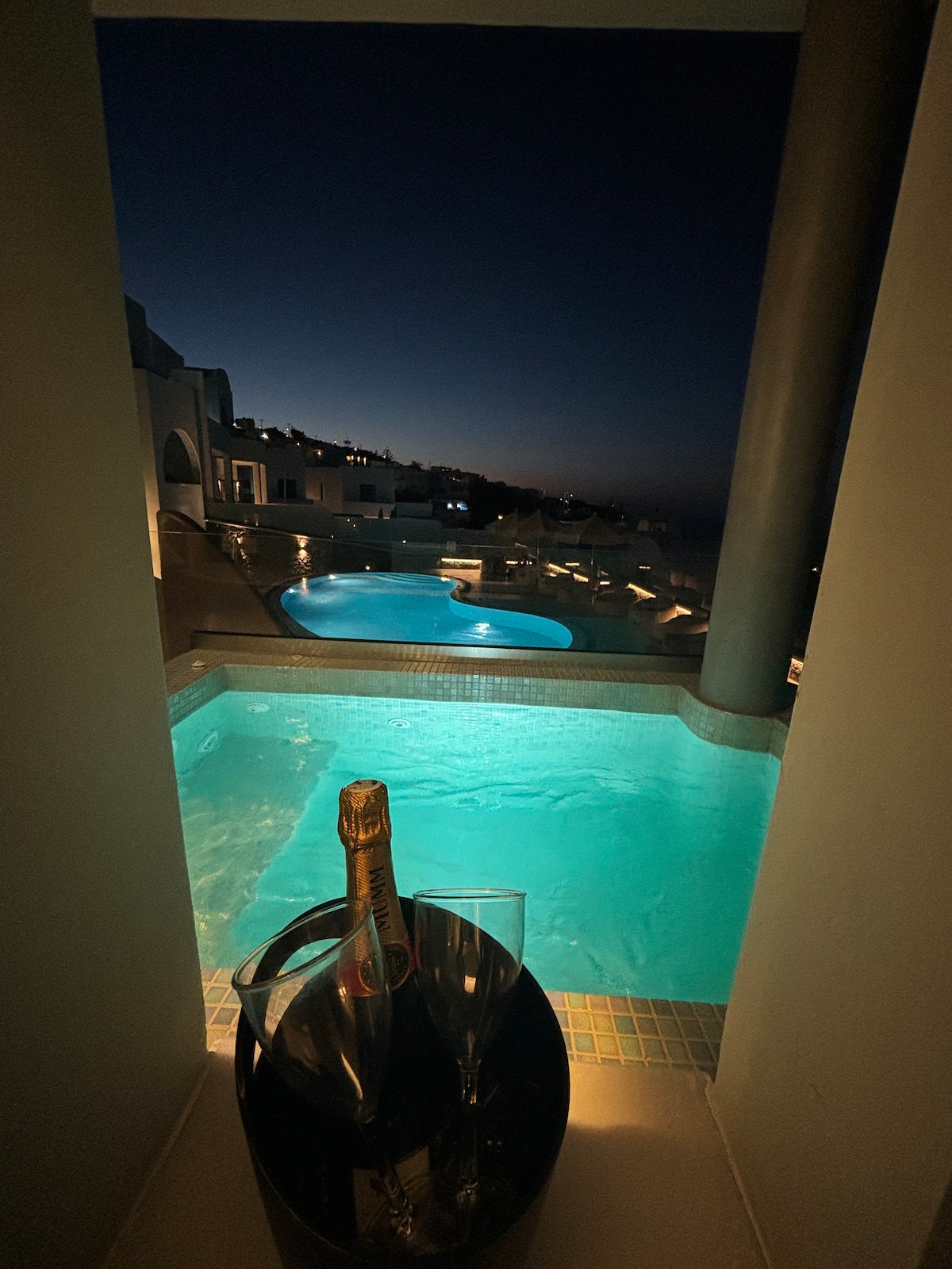 Junior Caldera Sea & Sunset View is located on the TOP of the caldera rim at Imerovigli overlooking the ocean (Aegean Sea), the well-known Caldera, the Volcano, the other nearby Cycladic Islands and the famous Sunset. This listing has a private and spacious for 2 people outdoor Jacuzzi/mini pool/ hot jet tub and cannot accommodate kids under 4 years old.
