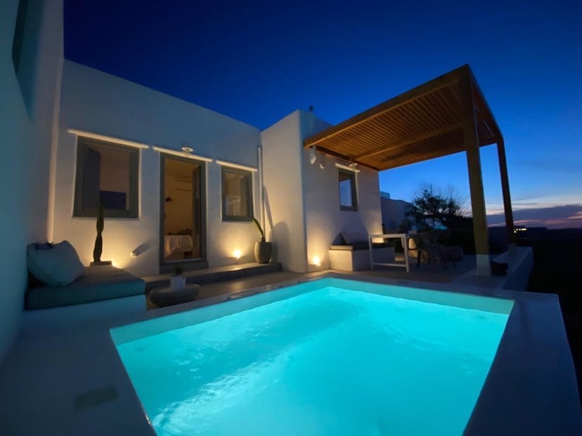 Anemos suite is located in Akrotiri overlooking the caldera and the volcanic islands . It is a suite with Private, Infinity heated Cave style plunge pool with Jet system and private patio. There is a king size bed that can accommodate two person. Daily breakfast is included and served in your suite . There is a cleaning service included. Inform us about your arrival details in advance , we can arrange a taxi/transfer for you.