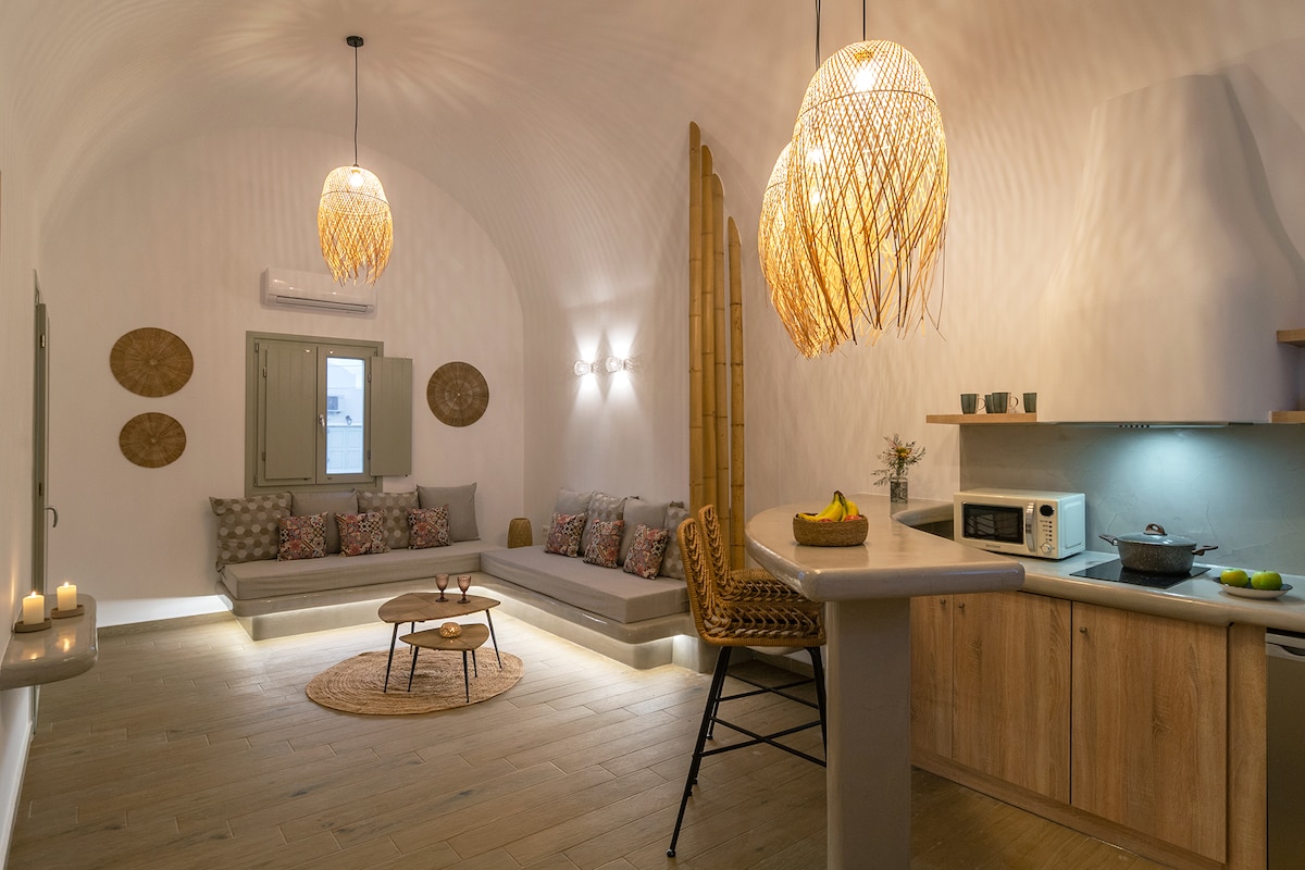 Anemos suite is located in Akrotiri overlooking the caldera and the volcanic islands . It is a suite with Private, Infinity heated Cave style plunge pool with Jet system and private patio. There is a king size bed that can accommodate two person. Daily breakfast is included and served in your suite . There is a cleaning service included. Inform us about your arrival details in advance , we can arrange a taxi/transfer for you.