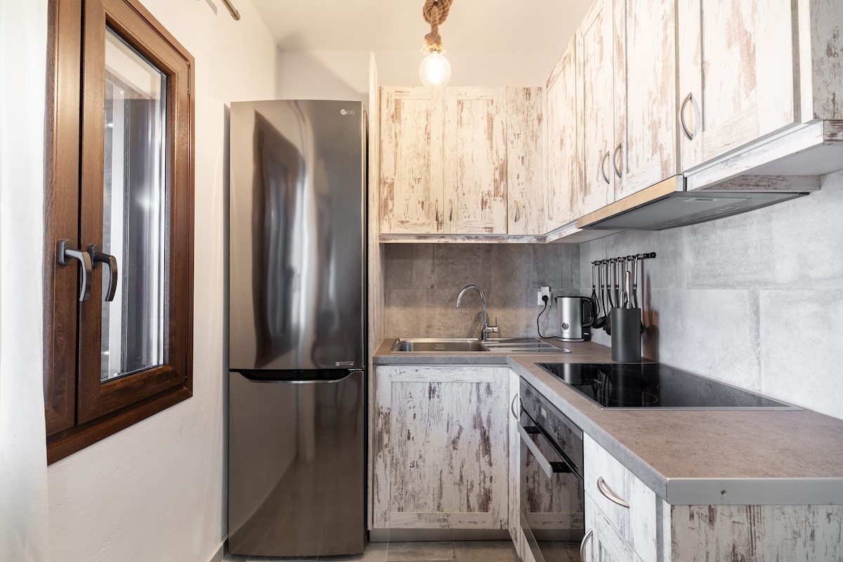 Our apartment is located close to Vourvoulos beach, 5 minutes from Fira center, 8 minutes from airport&15 minutes from Oia(driving distance). It has a bedroom with a small kitchenette (equipped with wash basin,water kettle,coffee machine,an electric grill,microwave&a fridge)& a bathroom. There is an outside area with sea view, a mini playground, a barbeque& parking. It's ideal for couples who like to relax & enjoy the nature. The price doesn't include the government tax of 8 euros per night.