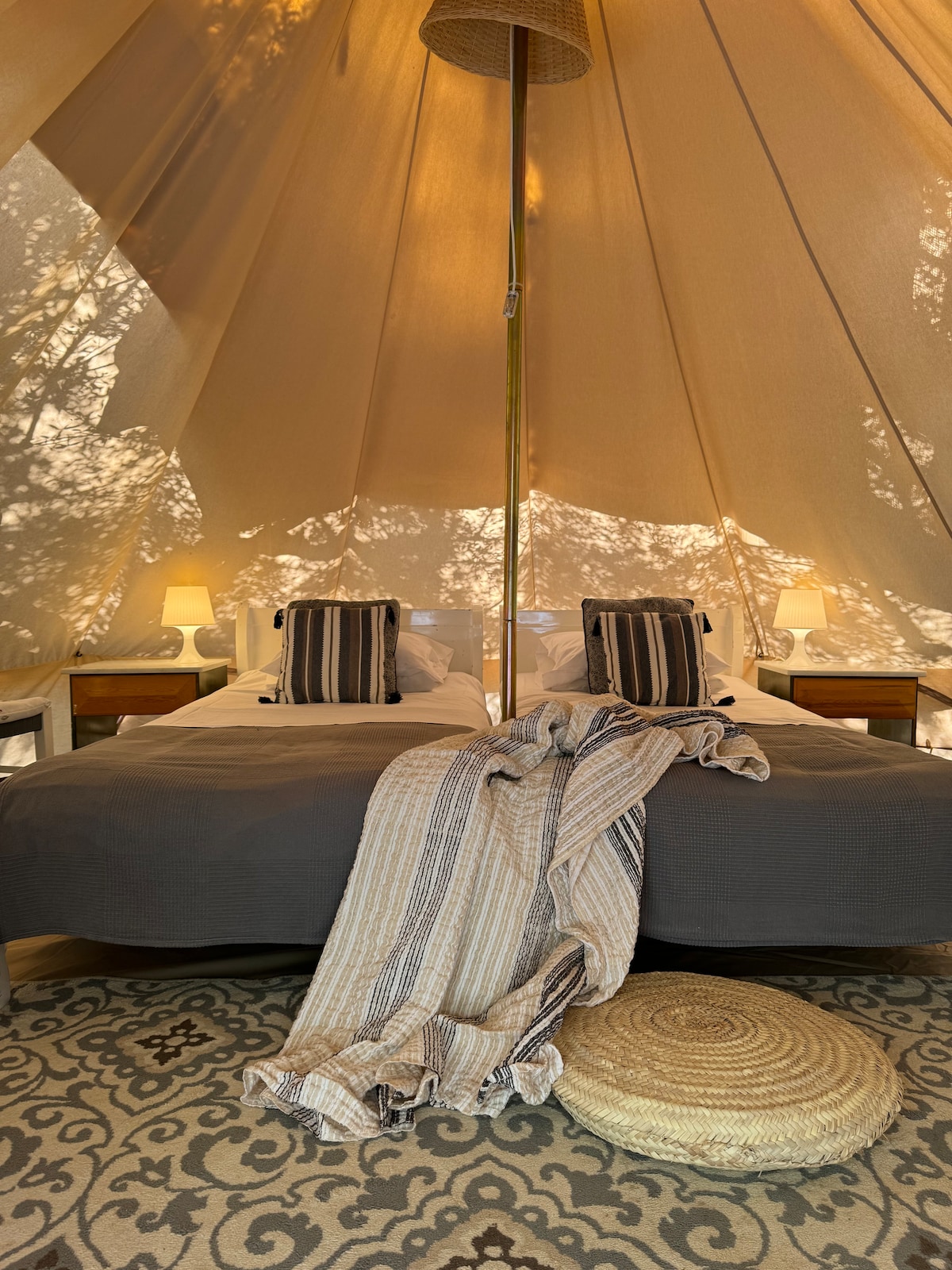 The bell tents are nestled between pistachio and olive trees. The bell tents are equipped with plush bedding, electricity and electric sockets with a plethora of usb ports, a pedestal fan and a clothes-hanger. We guarantee protection from nature creatures - mosquitos and bugs don't stand a chance with the 360-degree mesh wall and the mesh door. The luxurious shared toilets and showers are located just a few meters away from the tent. There is a private area with a picnic bench and a hammock.