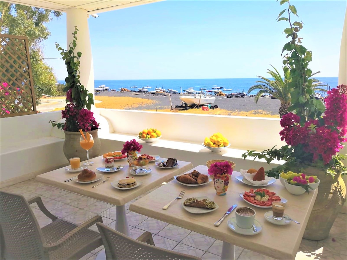 Its location, is simply great! Only 5 meters from the beach, facing the cobalt blue sea under the majestic Volcano. Located in the fishermen area, near the small marina, arrival point for boat trips and hiking treks on the volcano. Only 200 meters from the interesting Volcanological Museum and close to typical restaurants, bars, pizzerias, groceries, shops, tobaccos and bookshops.