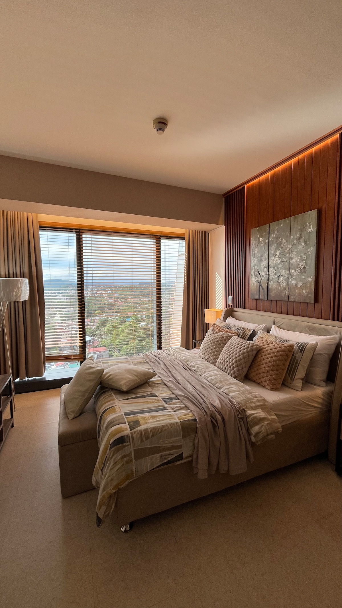 A 1-Bedroom Condo unit with 65 Sqm floor area. It has a beautiful scenery of Davao where you can enjoy the peaceful ambiance without compromising your comfort. This is located at the 18th floor, corner area unit of AEON Tower, Davao. Can accommodate 3-4 guests. Fully-furnished in a minimalist interior.