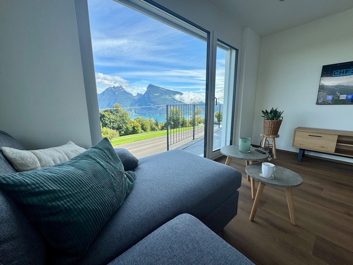 Welcome to your panoramic retreat at Lake Thun! Experience unforgettable moments in our exclusive 2-bedroom apartment in Gunten, directly on the shores of Lake Thun. Located on the 3rd floor (with elevator), this bright and spacious home accommodates up to 4 guests and offers breathtaking panoramic views of the lake and the Bernese Alps (Eiger, Mönch & Jungfrau). Enjoy the large private balcony as well as a fully equipped kitchen, a modern bathroom, private parking and easy self check-in.