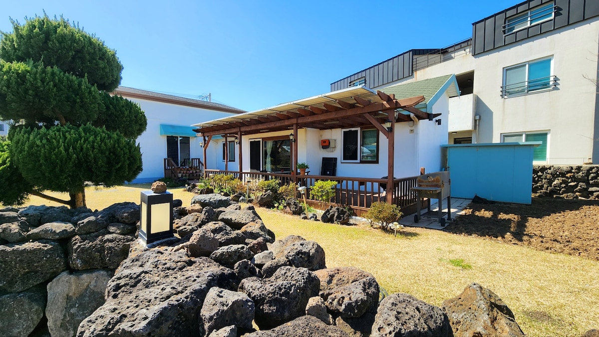- Private, two story wooden house, 2 Queen mattress bed rooms, 2 bathroom - Pretty flower garden & parking lot - Located in Aewol where it takes 30 min. from the airport. - Close to beach, takes 5 min. - Drum washing machine & detergent - TV, Wifi , Bluetooth speaker, Netflix - Nespresso coffee machine, Balmuda the pot, Microwave, Fridge, Water purifier, A/C - Bidet, Dehumidifier, Air cleaner - Maximum number is 4 including kid & infant.