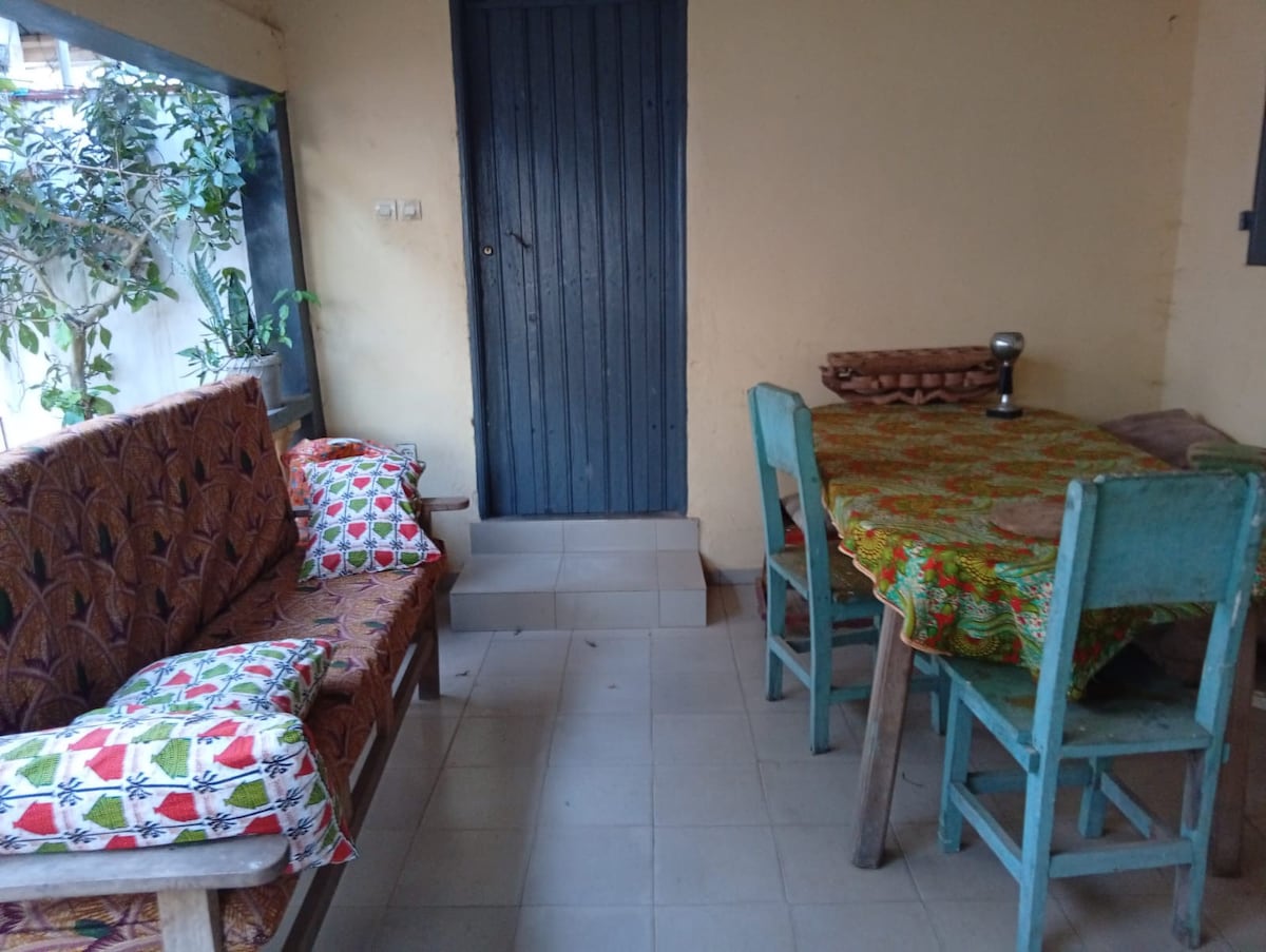 Dans notre maison, tout recemment rénovée, vous apprécierez la terrasse entièrement ouverte sur un agréable jardin fleuri et arboré. L'intérieur se compose d'un salon joliment décoré avec art local, mobilier bois, pagnes, d'une cuisine, en finition, mais qui dispose de tout le nécessaire. 3 chambres composent aussi la maison : 1 suite parentale avec sa sdb et 2 autres avec un lit double et 1 sdb pour les 2. Absolument sûrs que vous passerez un moment agréable, au calme à 2 pas du centre ville !