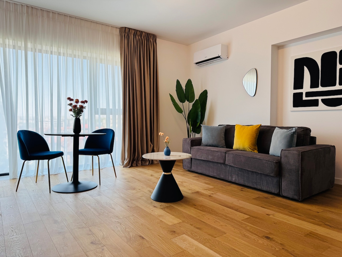 Immerse yourself in artistic elegance and effortless comfort in this stylish one-bedroom retreat. Perfect for business or leisure, this space invites you to unwind with a movie, savor a fresh espresso, or stay productive in a serene setting. Thoughtfully designed for relaxation and convenience, enjoy seamless self-check-in, high-speed WiFi, and nearby parking. Experience Bucharest in style—book now for an unforgettable stay!