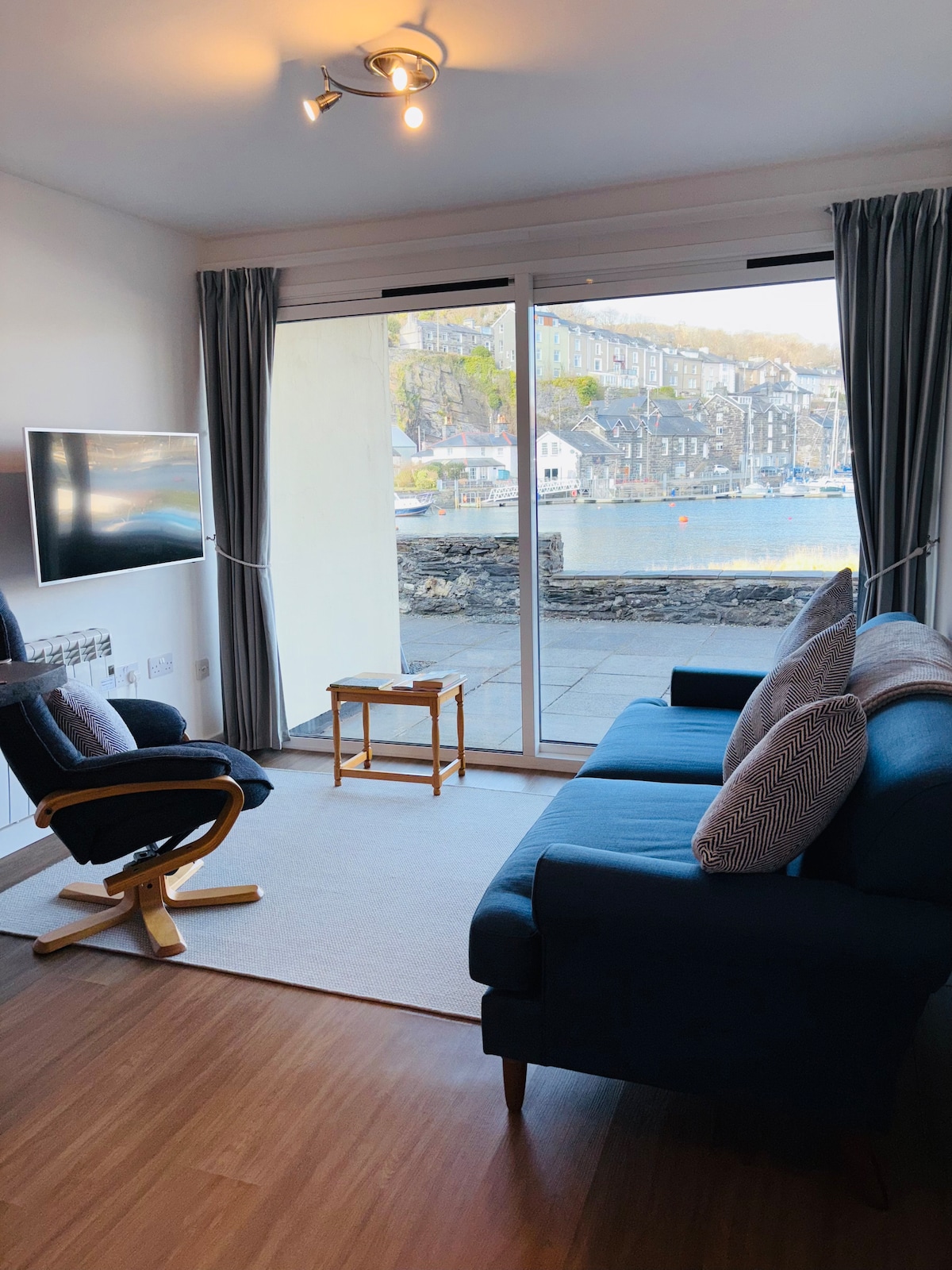 A cosy ground floor apartment with breathtaking views of the sea and harbour. Lovely views of boats coming and going and sea birds. If you're lucky you might see an otter or seal! Walking distance from Ffestiniog Steam Railway Station and Porthmadog centre, with its many cafes and shops. Beaches, castles, Portmeirion, Beddgelert and the wider Snowdonia National Park are all nearby. The apartment is perfect for a couple or a single traveller.
