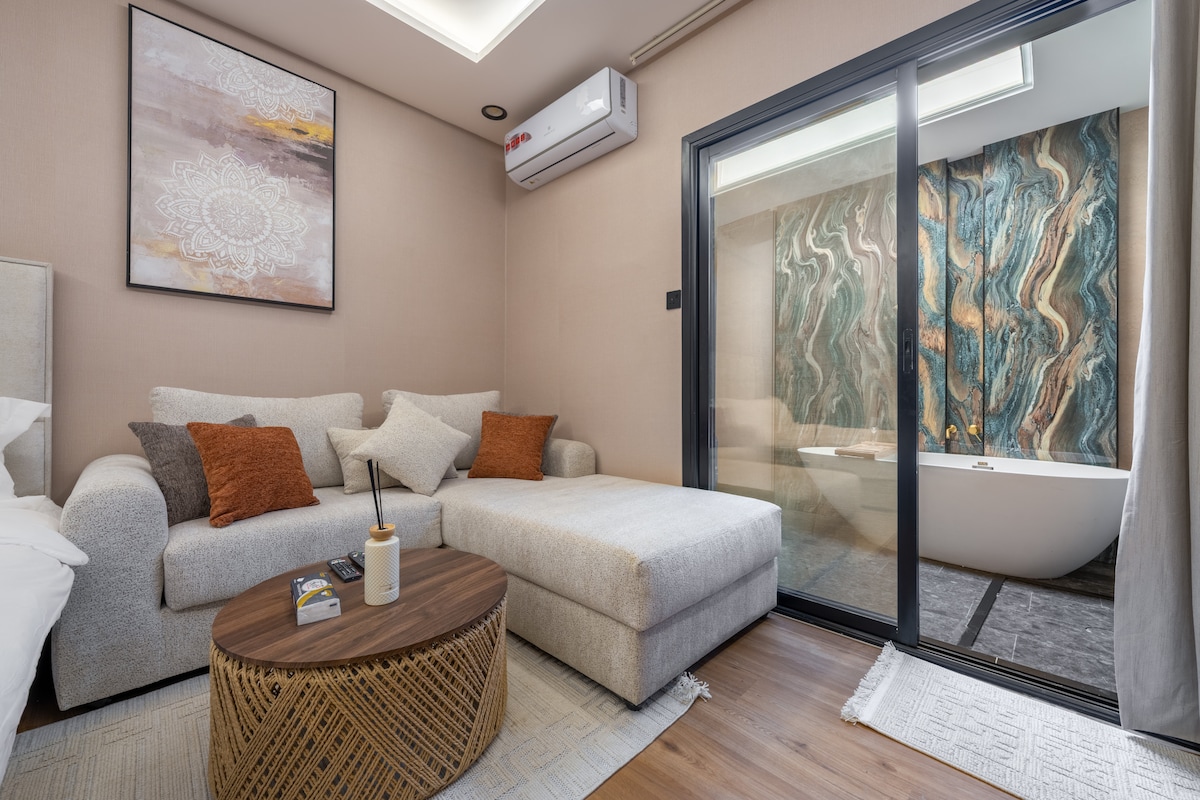 带浴缸和起居区的豪华酒店套房