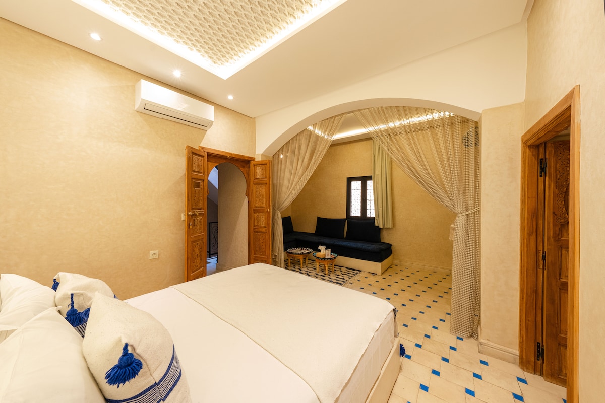 Willkommen in unserem liebevoll renovierten Riad im mitten im Herzen von Marrakesch. Wenn Ihr ein Paar, eine Familie oder eine Gruppe von Freunden seid, ist Dar Nurah der perfekte Rückzugsort für Euren Urlaub in Marrakesch. Da das Riad nur in seiner Gesamtheit vermietet wird, werden keine anderen Gäste anwesend sein. Die Wohnfläche beträgt insgesamt ca. 180qm. Es gibt 2 wunderschön eingerichtete Schlafzimmer mit eigenem Bad, ein Wohnzimmer mit Schlafsofa und viele offene Wohnbereiche.