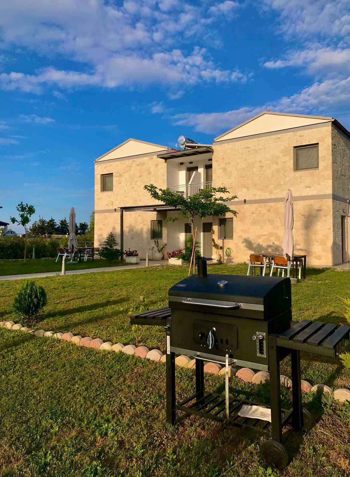 Modern cottage style house in a peaceful complex surrounded by nature, ideal for couples and families. Close to the exquisite sandy beaches, awarded for their crystal blue water. Fully equipped kitchen,1 bathroom,2 bedrooms connected through a door with one entrance and a living room. There is a beautiful terrace yard perfect for relaxing and amazing view, a high speed(50 Mbps) Wi-Fi and private parking area. Combined perfectly with the "Green House" or "Guest House" for 2 or 3 families.