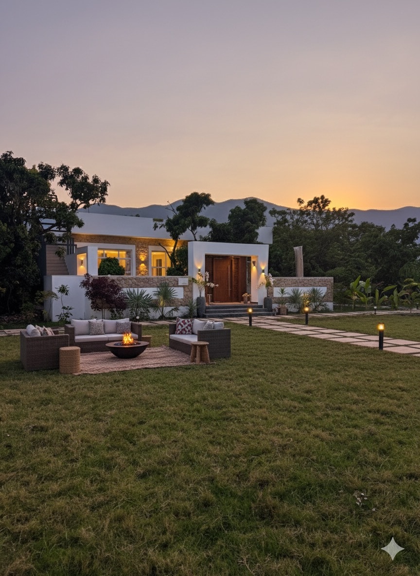 ◆Located a short drive from Jim Corbett National Park ◆Elegant 3-BHK villa offering comfort, nature & peace ◆Set on 8 acres of lush greenery with fruit trees & open fields ◆Surrounded by organic farming and natural beauty ◆Spacious wraparound balcony – ideal for morning coffee ◆Large terrace with beautiful scenic views ◆Bright living room with big windows & natural light ◆Elegant interiors with ambient lighting for a cosy vibe ◆Perfect for relaxing & spending quality time with loved ones