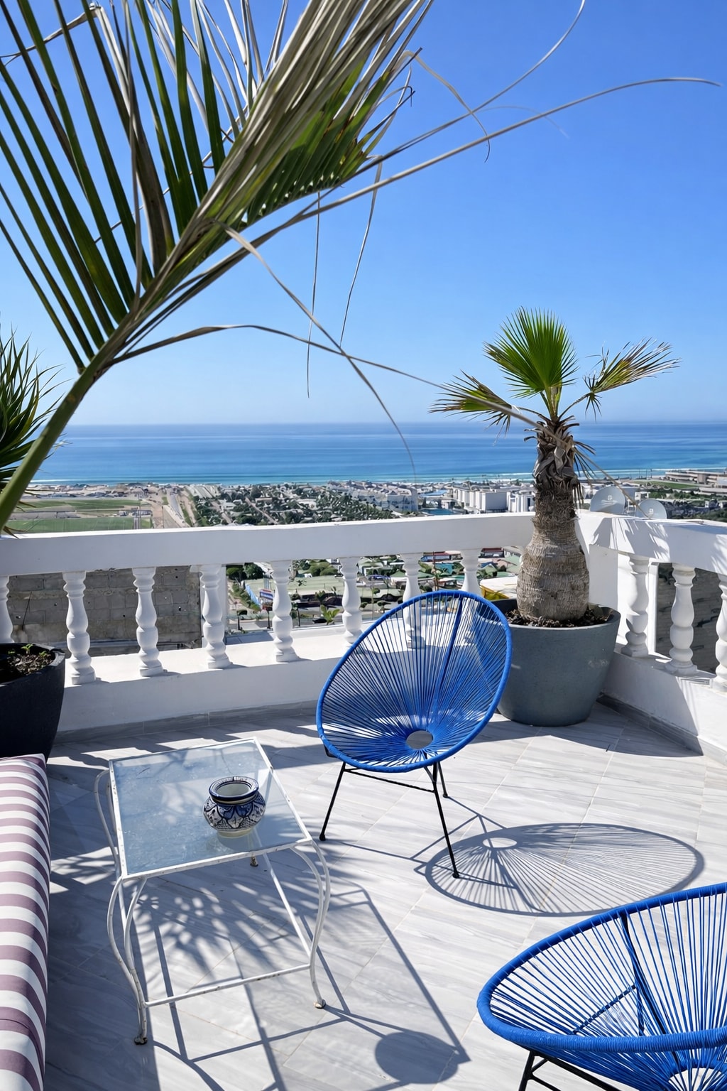 Luxurious penthouse with panoramic views of the Atlantic Ocean in the heart of Taghazout. Unique and sophisticated house, with attention to detail, from fine materials to designer furniture. The house has 4 bedrooms, two with double beds, one with en suite bathroom, a bedroom with two single beds and a spacious single room. Large living room with windows overlooking the ocean, an equipped kitchen overlooking the sea and a terrace with sofas, dining table and Barbeque. Hotel service on request.