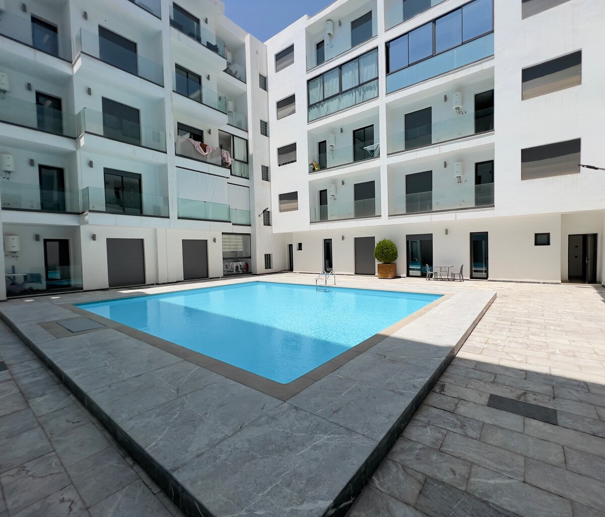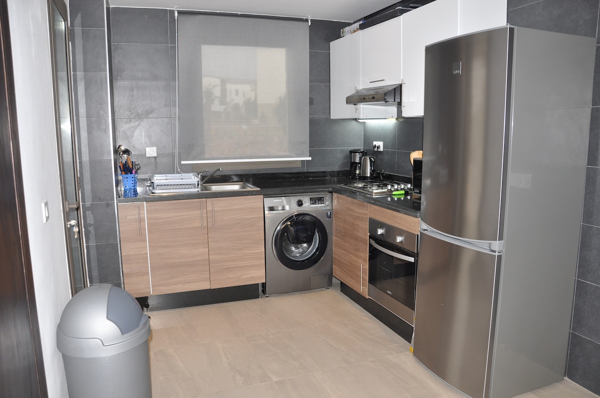 Modern apartment in the heart of the tourist center of Agadir with swimming pool & garden situated 10 minutes away (by walk) from the beach and 400 meters away from supermarket/Pizza Hut. In the neighborhood are the best coffee shops and restaurants. Very good equipment!
