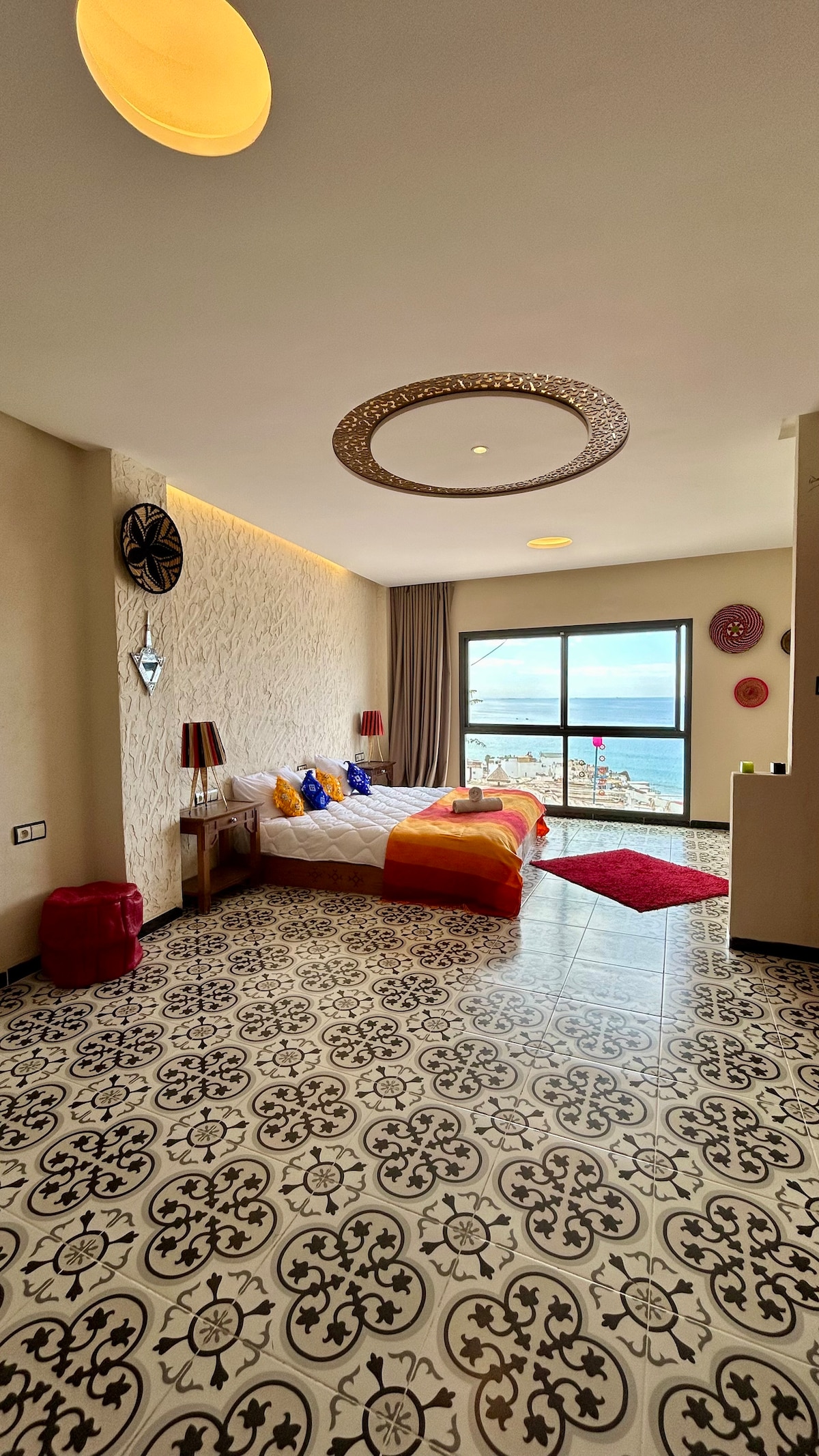 Ces chambres sont conçues pour les voyageurs en quête d'intimité et d'authenticité. Chaque chambre privée est agrémentée de touches marocaines qui vous feront vous sentir comme chez vous. Cette chambre dispose d'une grande fenêtre offrant une vue panoramique sur tout le village de Taghazout, le ciel limpide du Maroc et l'océan Atlantique. C'est l'endroit idéal pour admirer des levers de soleil inoubliables.