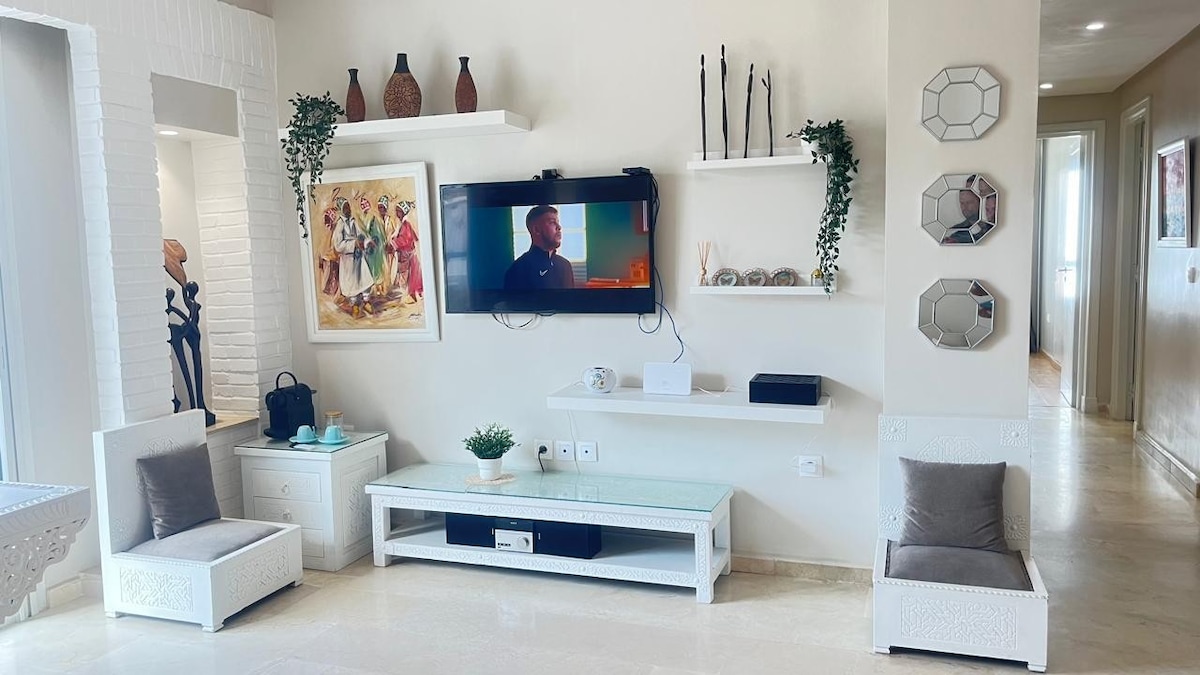 Sunny 1st-floor apartment in the heart of Agadir! Steps from cafés, shops & just 10 min walk to the beach. Relax in the cozy living area with a 65 inch TV, enjoy fast WiFi, and a fully equipped kitchen. Airport transportation available. ⚠️ Only registered guests; no outside visitors. Perfect for couples, friends, or business travellers!