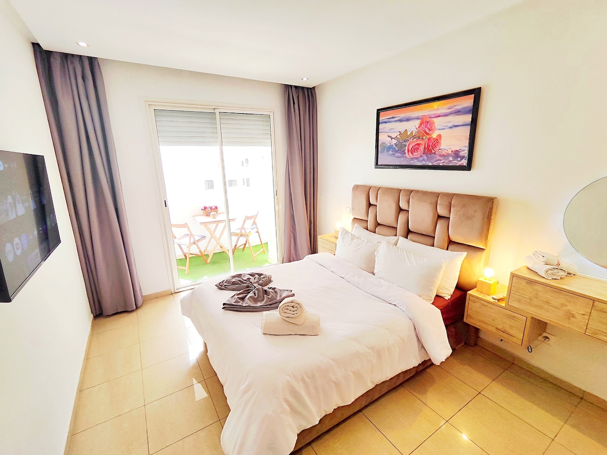 Bright and spacious apartment in Agadir, ideal for couples or business travelers. Enjoy exceptional comfort with a dedicated workspace, fully equipped kitchen, and relaxing balcony. The residence offers two swimming pools and free parking. Close to all amenities, this apartment is your haven of peace for a memorable stay.
