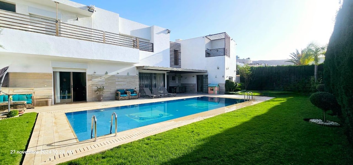 Magnificent high standing riad with small swimming pool, jacuzzi (3 * 4m). offering an unobstructed view of the ocean. Composed of 4 suites, a terrace, an equipped kitchen open to a large living room. Latest generation TV connect, Netflix, YouTube. Located in a quiet, secure area and close to small shops, beaches, golf, the big souk el Had, cafes and restaurants, relaxation center. Ideal for holidays with family or friends. 24/24 airport transfer on request.