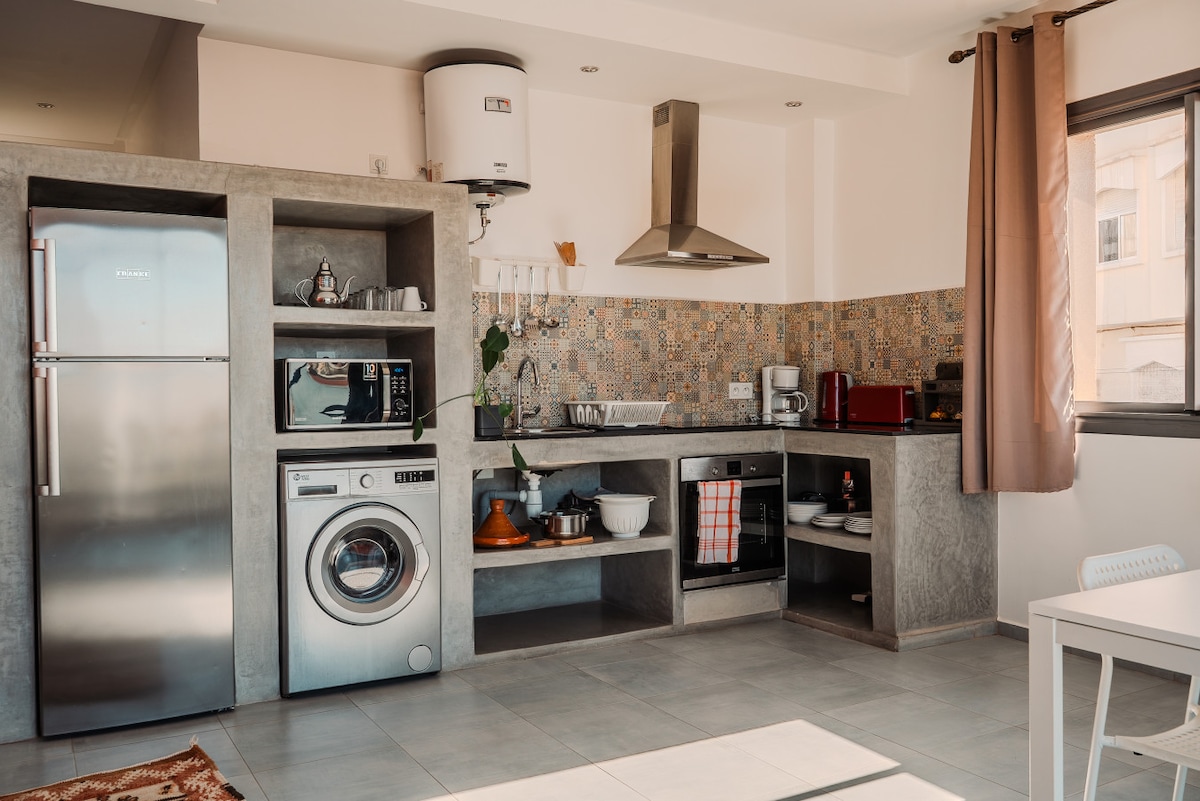 L'appartement est très calme, lumineux, frais, hyper propre, entièrement rénové, idéalement exposé et sa magnifique terrasse traditionnelle verdoyante et arborée donne sur l'Atlas. Situé au coeur de la ville sur la plus belle avenue, il est près de la plage comme des quartiers traditionnels, de la vie nocturne et des transports en commun. Idéal pour les couples, les voyageurs en solo, les voyageurs d'affaires et les familles (avec enfants).