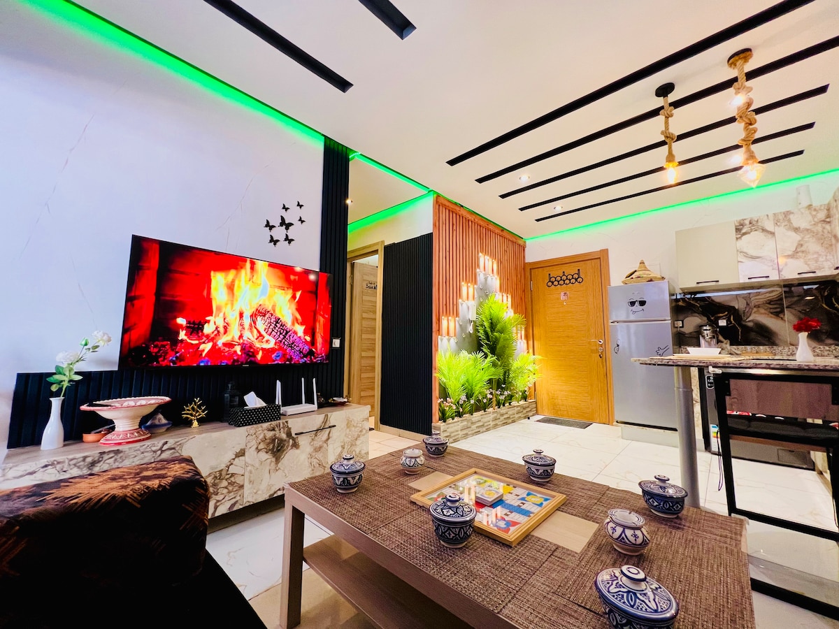 Welcome to your new luxury 2 bedroom apart in AGADIR, just 5 minutes from the beach. ✔ 2 comfortable bedrooms ✔ Bright and stylish living room ✔ Traditional Moroccan zellige touches ✔ High-speed Fibre WiFi ✔ Free parking ✔ Beautiful terraces to relax ✔ Fully equipped kitchen ✔ Sports equipment available for guests ✔ Calm, secure, and modern residence you are close to everything: Beach Cafés & restaurants Shops & supermarkets Easy transport We look forward to welcoming you!