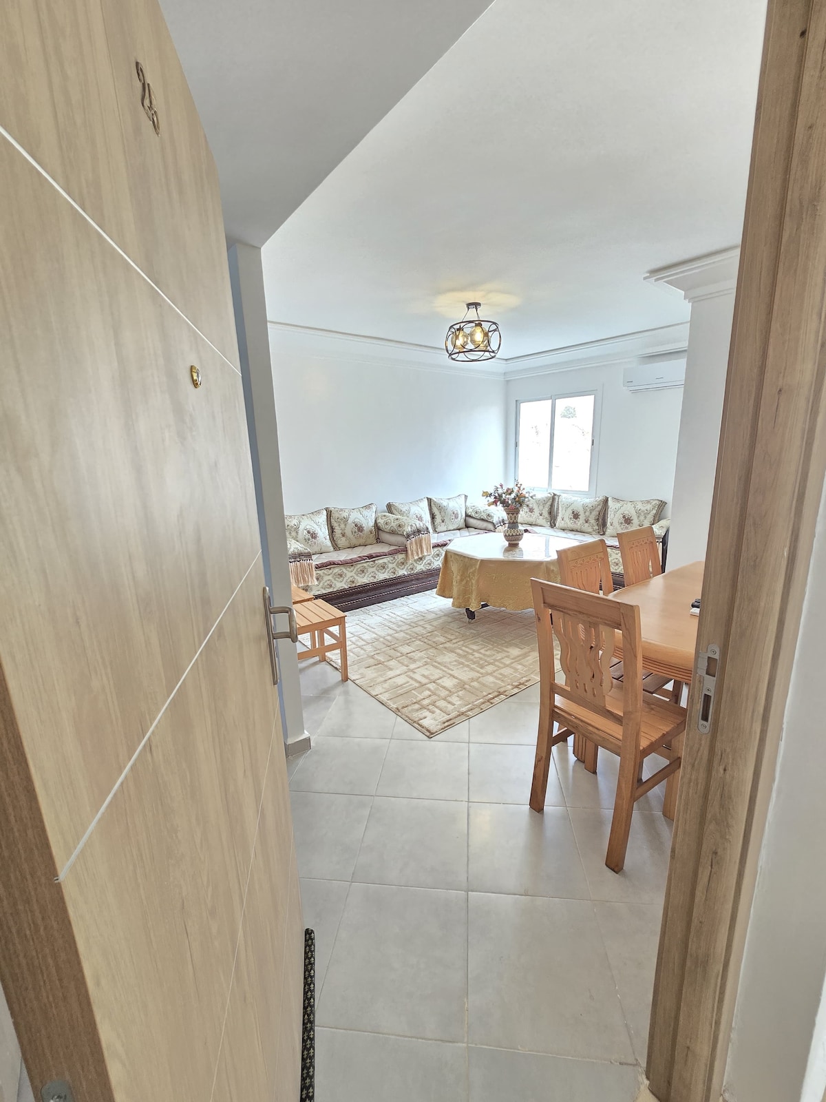 Beautiful apartment filled with natural light" in the heart of Agadir, just 10 minutes from the beach. Located on the 1st floor of a secure residence, with 2 comfortable bedrooms, a cozy living room, a fully equipped kitchen, a workspace, Wi-Fi, and IPTV. Balcony overlooking a garden—perfect for enjoying the sunrise. Less than 100m away: taxis, restaurants, currency exchange, pharmacy. Quiet and friendly neighborhood with shops and cafés open past midnight. Ideal for a peaceful stay.