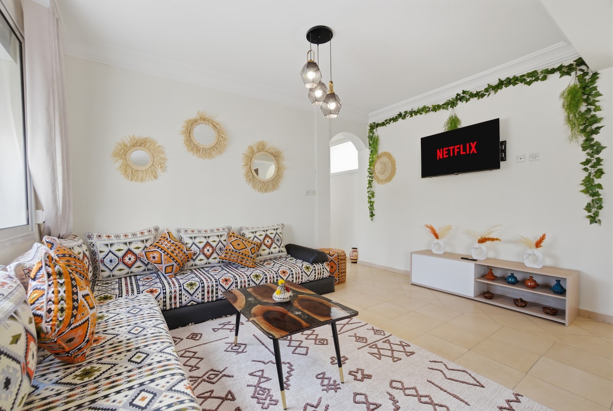 Our duplex apartment, just 3 minutes from the beach, offers 2 bedrooms, 2 private terraces, and all amenities.Short Walk distance to shops, cafes, and restaurants, plus surf hotspots like Devil's Rock and Banana Beach. Whether you're a pro or beginner, Tamraght's consistent swells and long beaches make it a surfer's haven. Unwind on your terrace with panoramic Atlantic views, Late night conversation with loved ones, and create lasting memories in Morocco's surf paradise