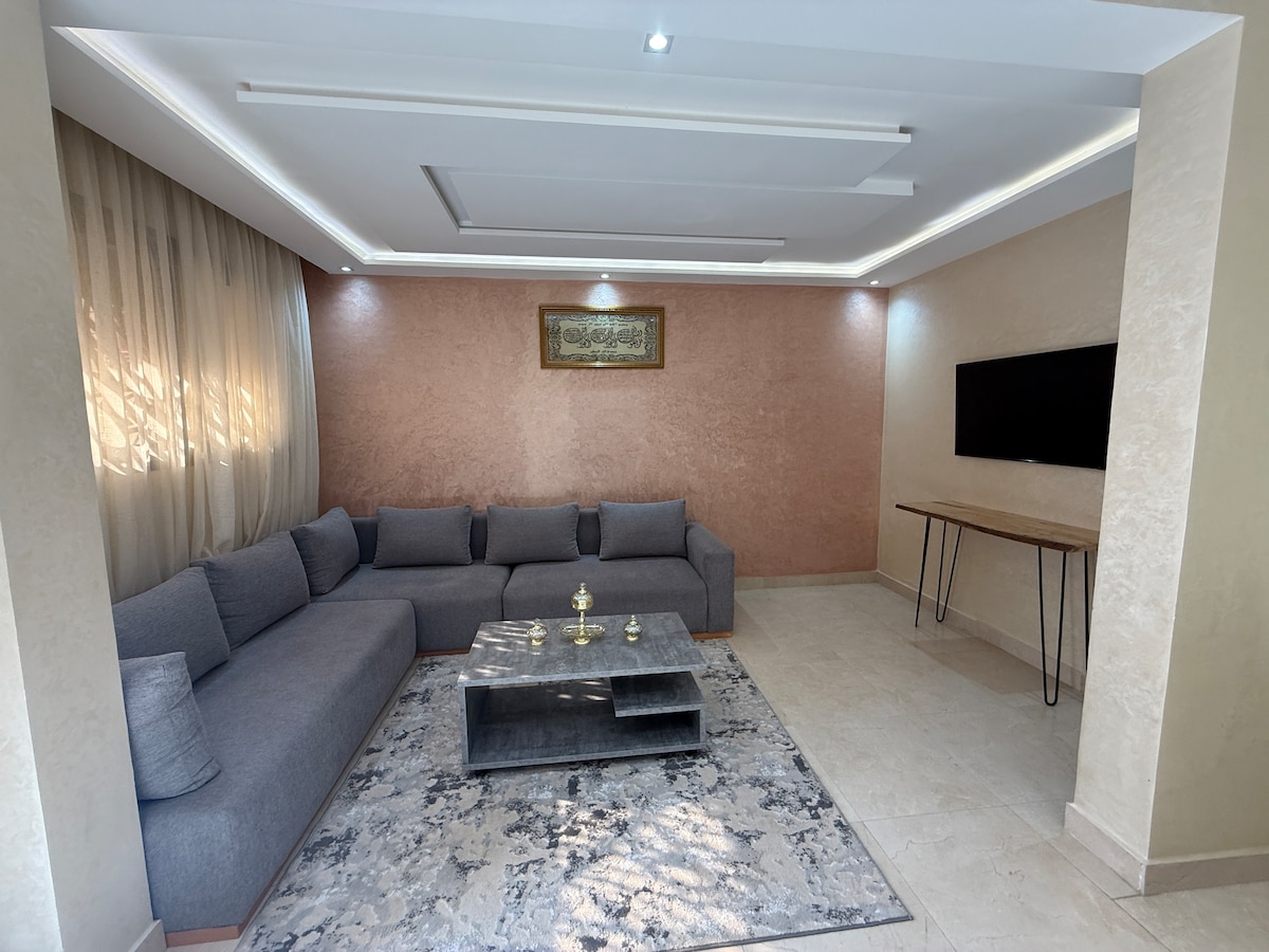 Appart à 2 mins de le plus grand bazar de l'Afrique souk El had, se compose d'un vaste salon conviviale avec un TV Android IPTV et wifi avec un coin de détente confortable 2 chambres disposent de lits confortables. Cuisine équipée disposant d'un réfrigérateur, four, micro-ondes, cafetière Wc et douche. Grande terrasse ensoleillée pour profiter du soleil. l'appart d'une superficie de 80 m², situé dans un cartier au centre ville calme et sécurisée, à 5 mn en voiture de la plage d'agadir.