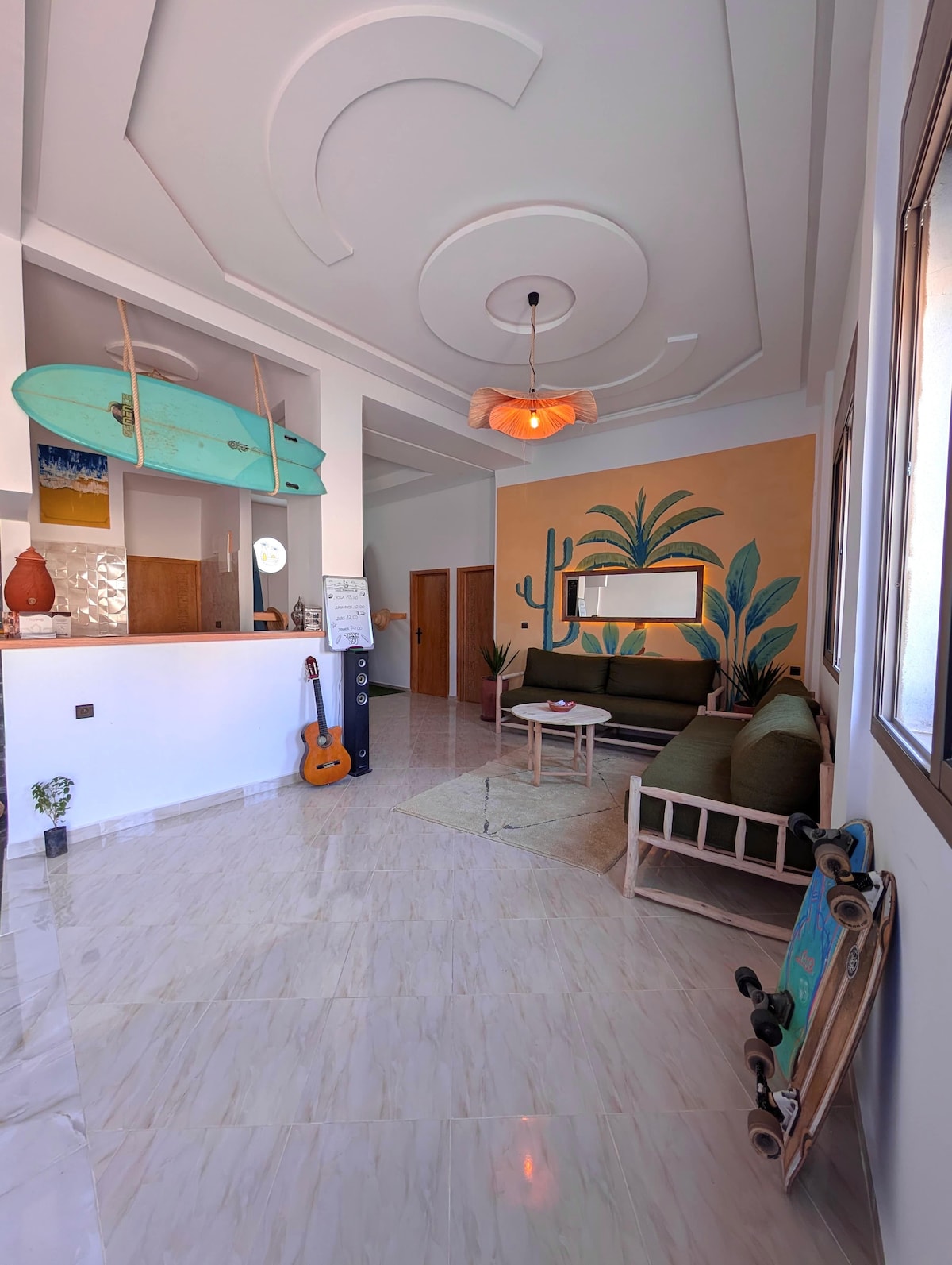 Welcome to Omar's Surf Shack, a shared guest house nestled in the heart of Tamraght, a town steeped in the rich history of surfing. Immerse yourself in the vibrant local culture managed by a welcoming family eager to share their traditions. Choose between shared and private rooms, with communal bathrooms and access to a well-equipped kitchen. The highlight is our roof terrace offering breathtaking views of the town and sea.