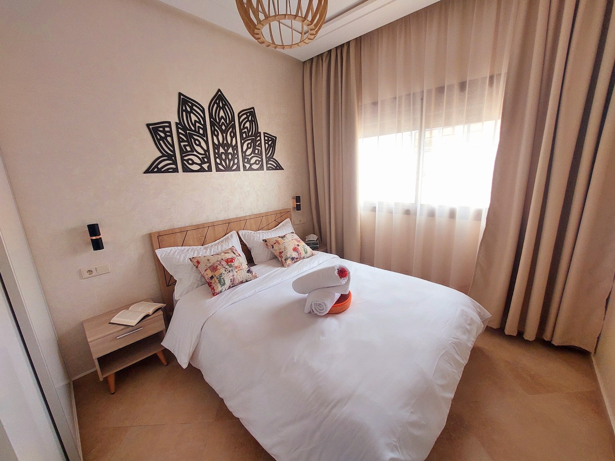 Live the Agadir Luxury Experience. This elegant retreat, just steps from the beach , blends comfort, design, and prestige. Enjoy a fully equipped kitchen, fiber Wi-Fi, workspace, A/C & heating, pool, two private terraces, parking & security. Steps from top restaurants (McDonalds , pizza Hut, El Bahja Sushi, Bayt Al Mandi, Vitamix open till 4 AM) and lounges. On request: driver-guide, private chef, maid, airport transfer, and any other service in Agadir.