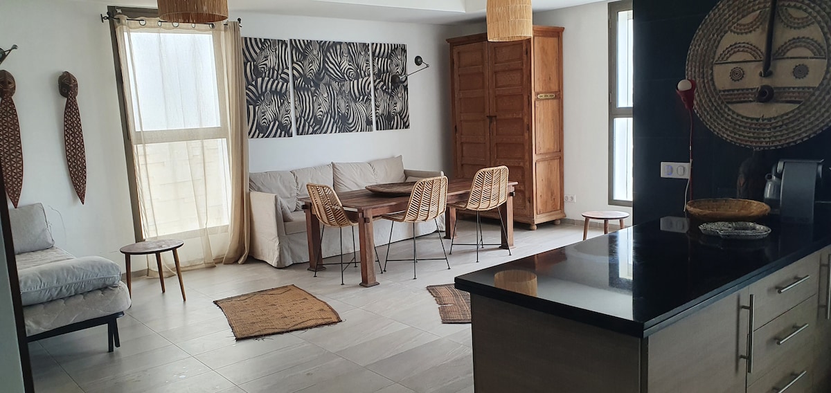 The apartment offer's private bathroom and shower with kitchen, one bedroom apartment with a large living room. In total this space can accommodate up to 4 people. two sleeping in the bedroom and other two in the living room space that offers two sleeping beds. The House offer a beautiful large garden with a swimming pool with an amazing inside living room space for yoga or dancing, where we make special events sometimes, with Roof-top terrace overlooking Agadir city 20km away
