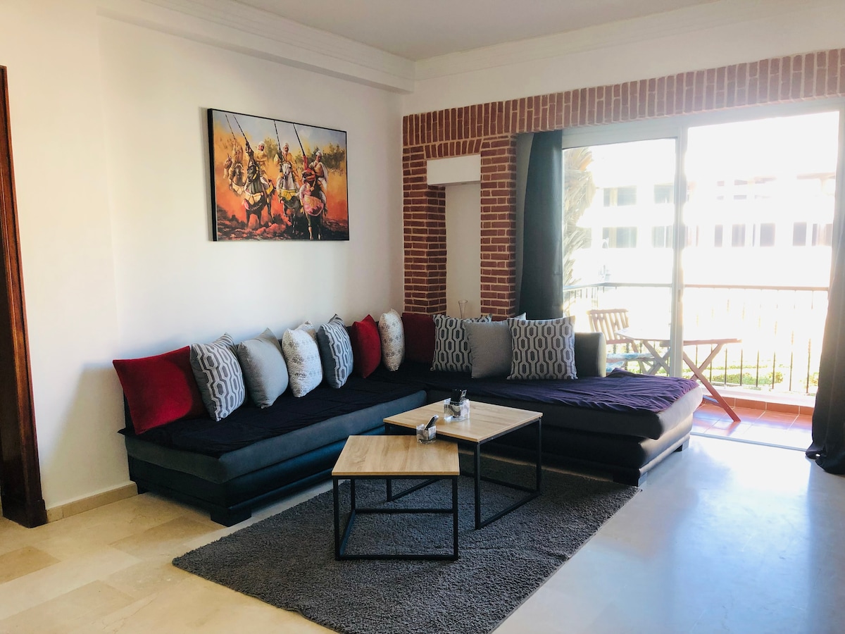 Bienvenue chez nous ! L’appartement est situé dans la luxueuse résidence de la Marina d’Agadir, sécurisée, équipée de 3 piscines, dotée de beaucoup d’espaces verts, boutiques, restaurants et d’une plage de sable fin à 200 m, de quoi ravir toute la famille. L’appartement de 115m2 vue piscine est 100% équipé, meublé avec goût, doté de 2 grandes chambres (dont Suite parentale), de 2 salles de bains, d’un salon (couchages pour 3 personnes) avec cuisine américaine, de 2 balcons et d’une loggia.