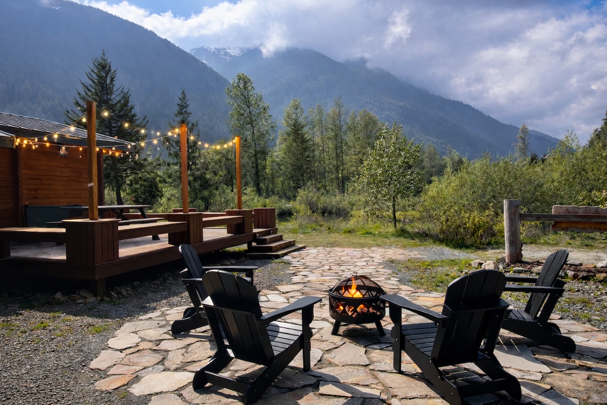 Large 1700 sqft cabin, amazing SUNNY mountain views with sheltered hot tub, large BBQ deck with table/lounges, fiber wifi, King bed, with walk in closets and private bath, music/TV, fire pit, living room fireplace, board games/corn hole, guidebook, fully stocked, air-flyer/toaster, window AC, this cabin has it all. Located next to Canyon creek/Nooksack river hiking paths.Several skylights in home, if sensitive to light.All new appliances 2024. Come & enjoy, video @getaway2008!