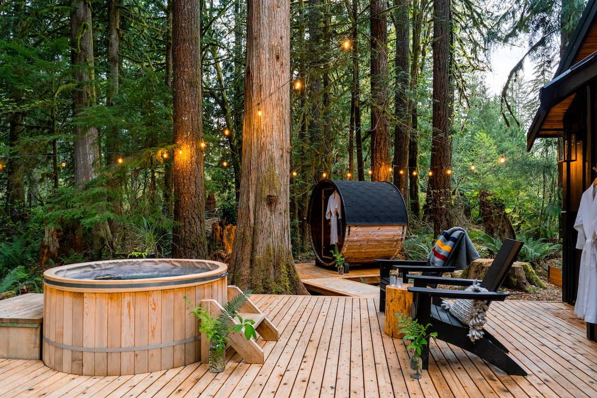 A private couples spa cabin near Mt. Baker for anniversaries, honeymoons, proposals, ski weekends, hiking adventures, and quiet romantic getaways for two. ✔️ Cedar hot tub ✔️ Panoramic barrel sauna ✔️ Outdoor cold-water shower ✔️ Fire pit + indoor gas fireplace ✔️ EV charger ✔️ Backup generator ✔️ 30 mins to Mt. Baker Ski Area ✔️ 10-min walk to Canyon Creek ✔️ 30+ trails nearby 586 sq ft of cozy, modern comfort 🌲✨ Please note: the cabin isn’t suitable for children or infants