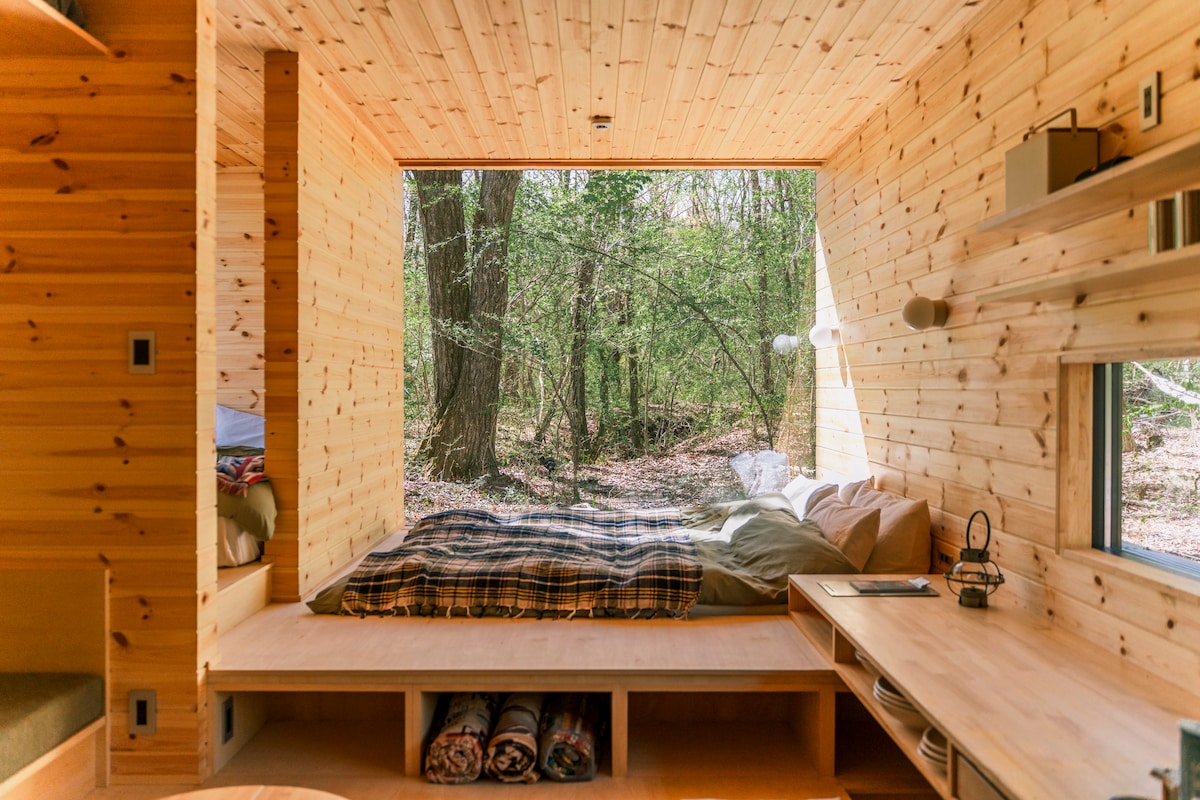 独享森林度假屋:您的专属自然休憩地 想象一下,拥有一片3300平方米的原始森林,只属于您。这是一栋每日限定一组客人的度假屋,您可以通过大窗欣赏四季变换的森林,在柴火桑拿中感受极致的放松,并围着篝火度过美好的时光。我们提供一种全新的户外体验,让您在沉浸于大自然的同时,也能享受室内的舒适。在这里,您将拥有属于自己的、不受任何束缚的时光。 尽情享受森林柴火桑拿 我们的场地内设有一间配备爱沙尼亚HUUM炉的专业柴火桑拿房,供您独家使用。木柴燃烧的噼啪声、柔和的温暖、以及使用浅间山泉水打造的天然冷水池——一种极致的“totonoi”(深层放松状态)体验等待着您,调动您的全部五感。宽敞的木质露台让您可以在森林中进行冷却,与大自然融为一体。在您自己的森林中,享受无人打扰的桑拿体验。 住宿:自由与舒适兼得 室内空间最多可容纳5位客人。如果您自带帐篷,最多可容纳11人入住。 白天在户外尽情玩耍,夜晚在柔软的床上安然入睡——这里提供了一种兼顾“自由”与“舒适”的全新户外住宿体验。一栋小房子,一片无限的森林。来到“Futo Tiny 北轻井沢”,找回属于您自己的、不受束缚的自由。