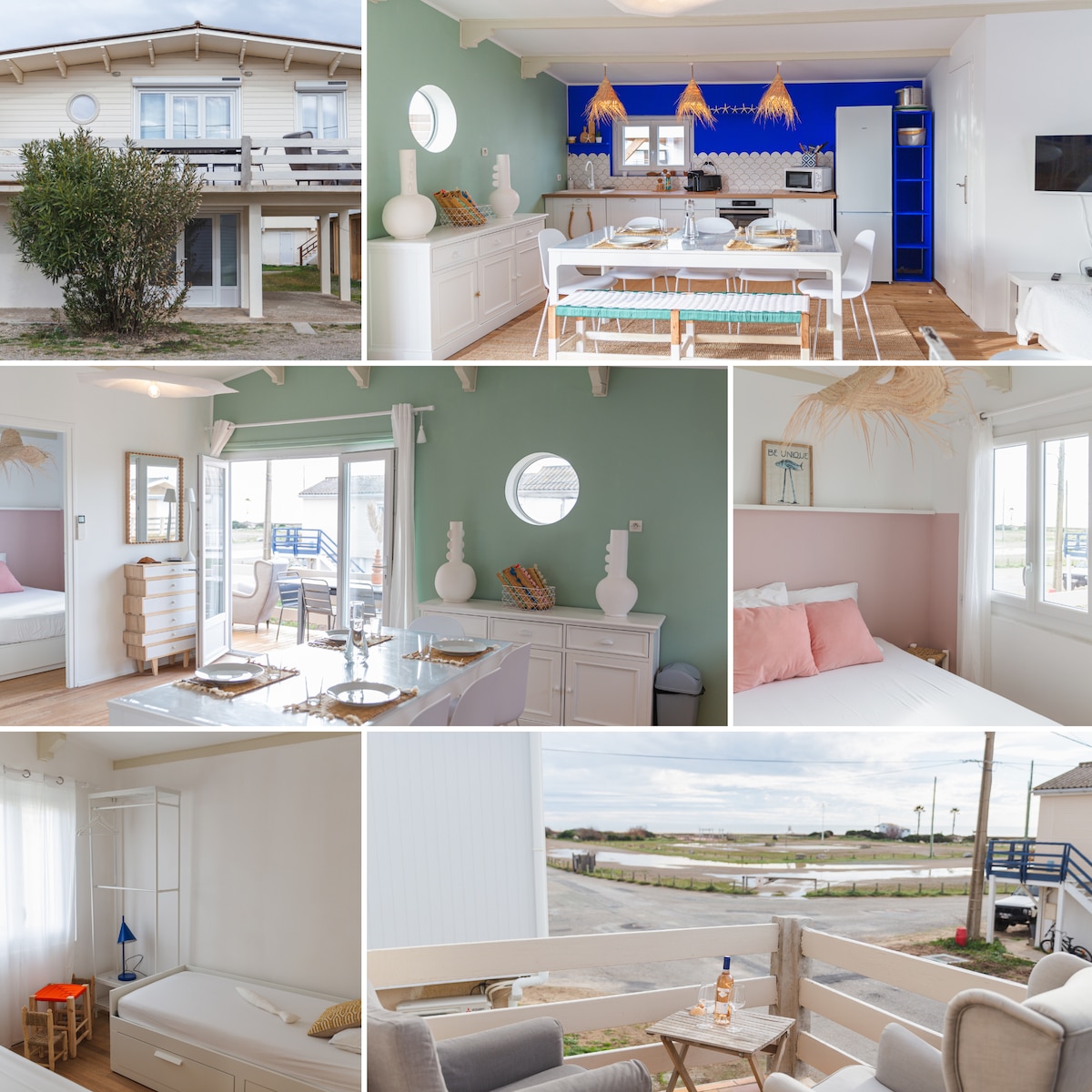 Grand chalet vue mer entièrement rénové très confortable et chaleureux pour vous sentir comme chez vous. En 2ème ligne front de mer, les pieds dans le sable, le chalet est sur 2 niveaux avec UN PLUS, un escalier intérieur. Une pièce à vivre très lumineuse qui communique avec une belle terrasse équipée de transats et d'un espace repas. Les chambres, RARE pour les logements à cet endroit, sont spacieuses. La décoration "esprit bord de mer" est soignée. Le chalet a : climatisation et chauffage.
