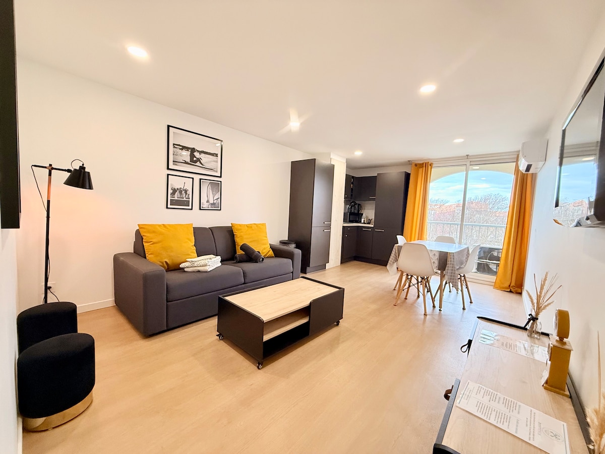 ⛵ Enjoy Sète's climate and atmosphere by staying in this charming apartment. 🐟 On the third floor of a recent building with elevator and secure basement parking. This bright apartment features a large living room with open kitchen, a bedroom with queen-size bed and storage space, a loggia, balcony, shower and separate toilet. Located just a five-minute walk from the town center and buses to the beach. In the immediate surroundings: supermarket, pharmacy and restaurants. Enjoy your stay!