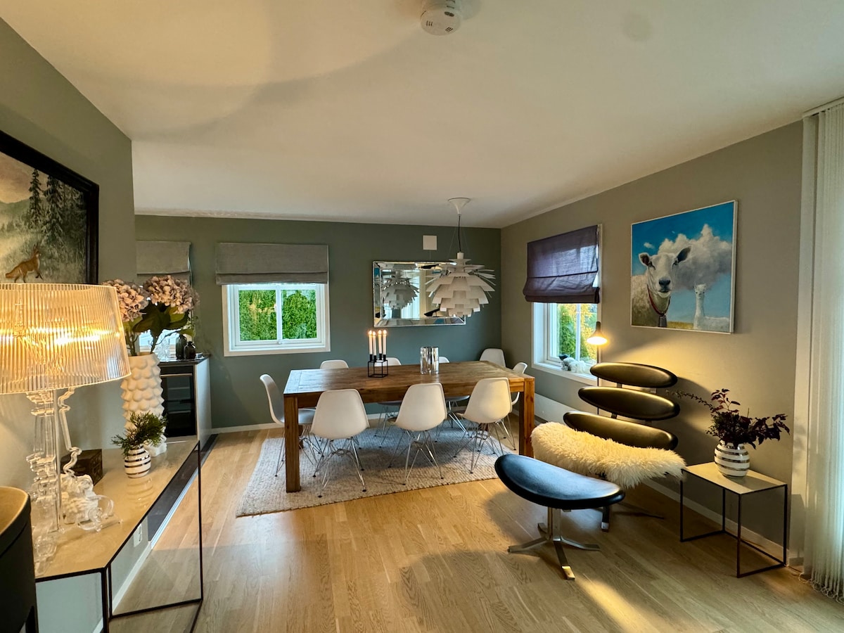 Enjoy panoramic views of Kristiansand from this fantastic house with a pool. The house features a large living room and a spacious TV room, perfect for relaxation. Bjørn, born and raised in Kristiansand, provides great recommendations on places to explore. Perfect for an unforgettable vacation! The neighboring house, 10 meters away, can be rented together with ours, offering an additional 5 bedrooms. See aerial photos in the listing!